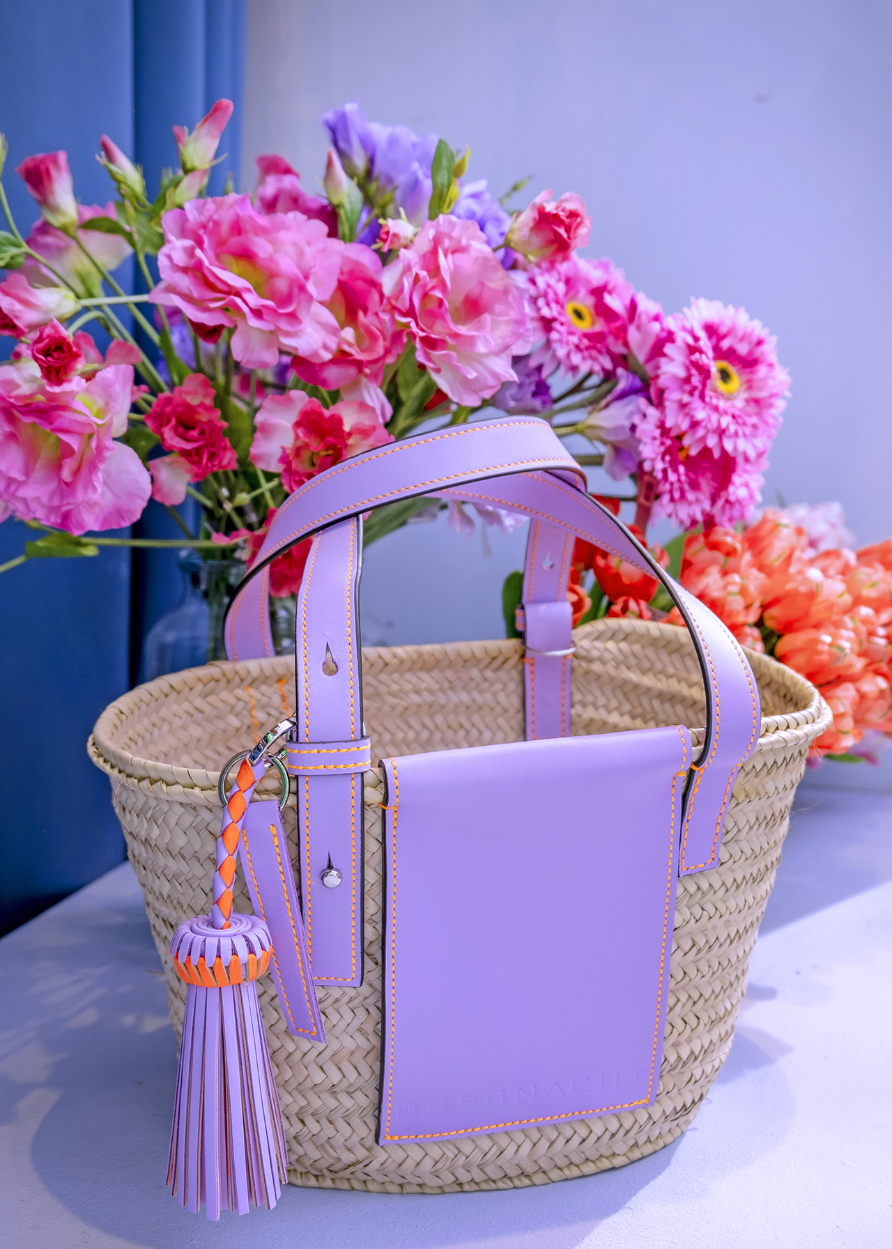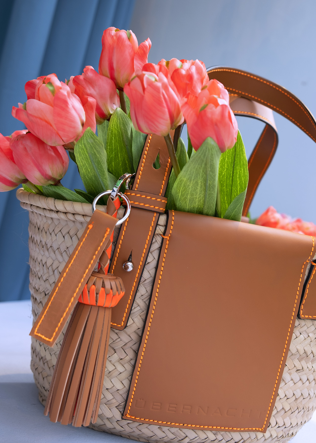 BASKET BAG WITH DECORATIVE STITCHING, INSIDE MOBILE PHONE POCKET & ADJUSTABLE CARRYING HANDLE BY ÜBERNACHT, WOVEN PALM LEAVES & CALFSKIN: 395€