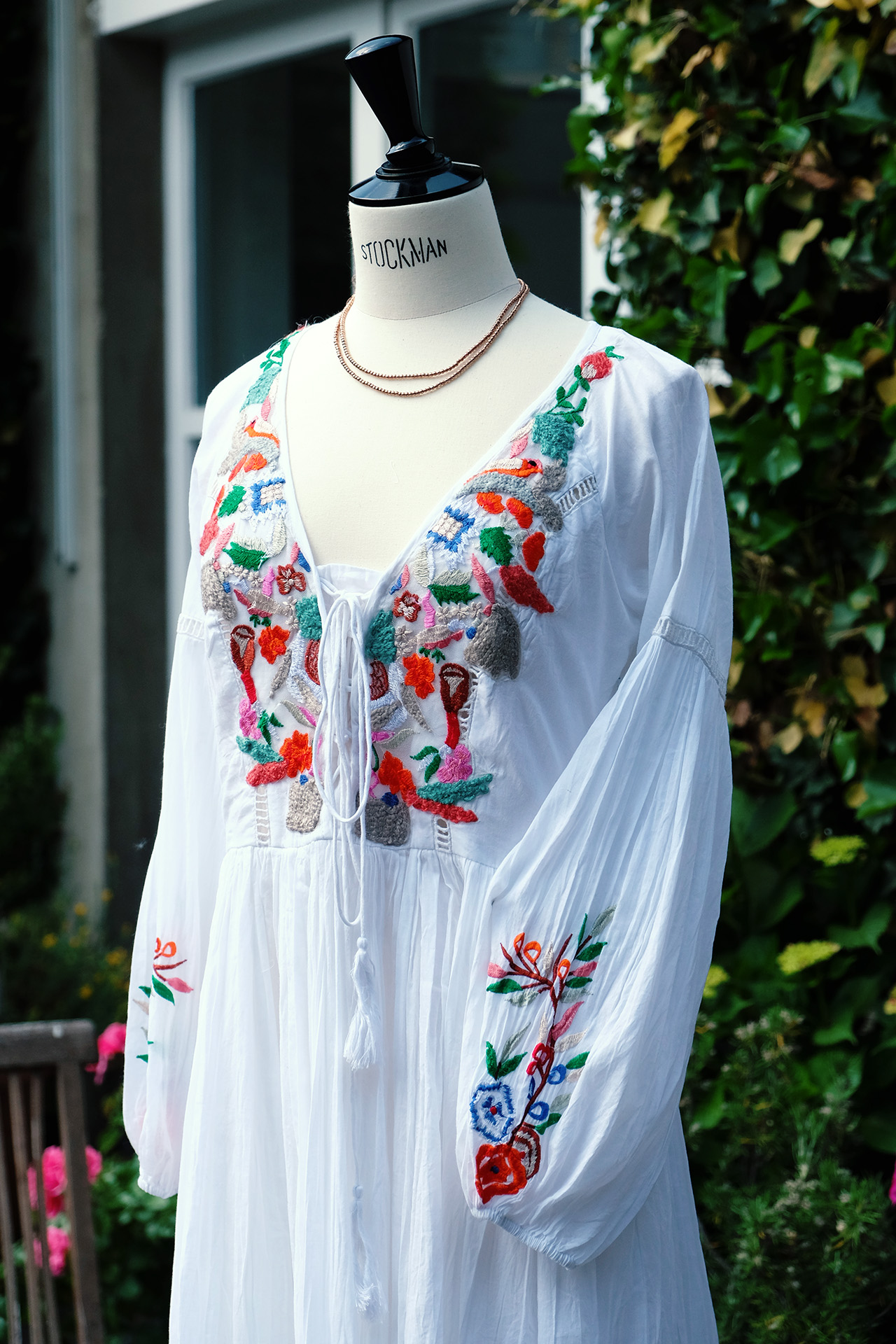 BESTICKTES MAXIKLEID IM ANGESAGTEN BOHO-STYLE VON PEACE AND LOVE KOMBINIERT MIT UNSERER LETZTEN ZEHENSANDALE VON K. JAQUES AUS ST- TROPEZ.