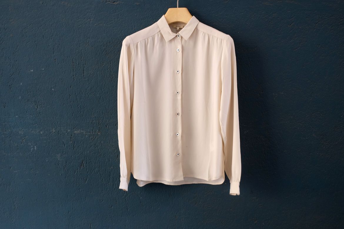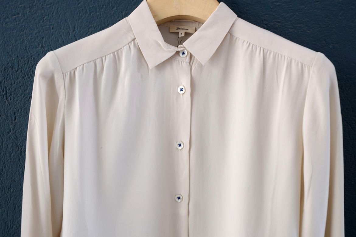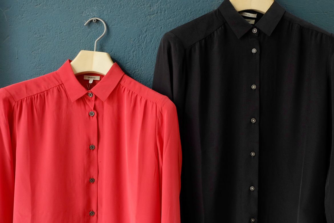 Die Blusen von dem belgischen Label Bellerose sind aus Seide. Es gibt sie in den Farben Schwarz, Creme und Rot.