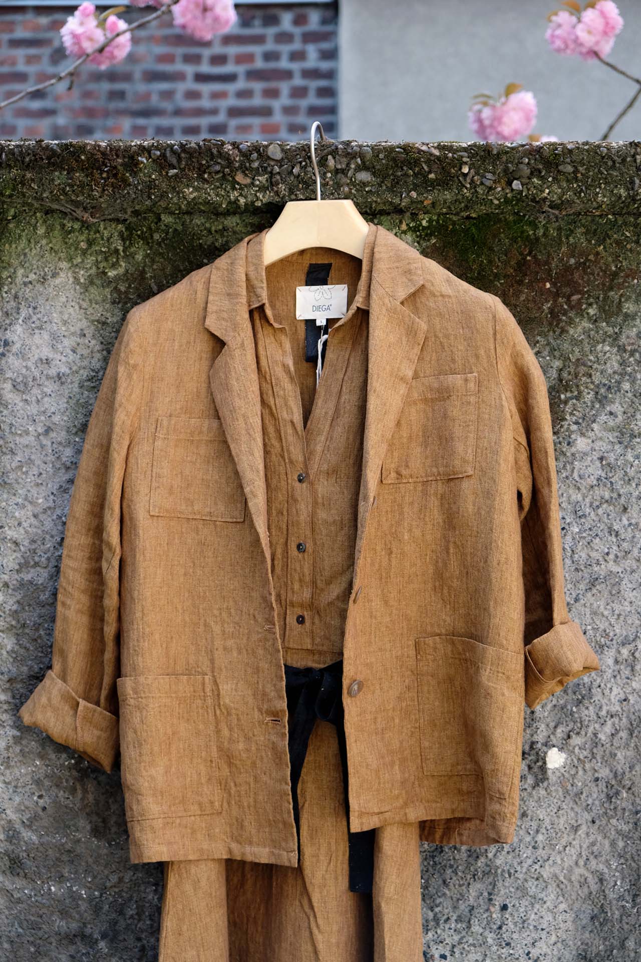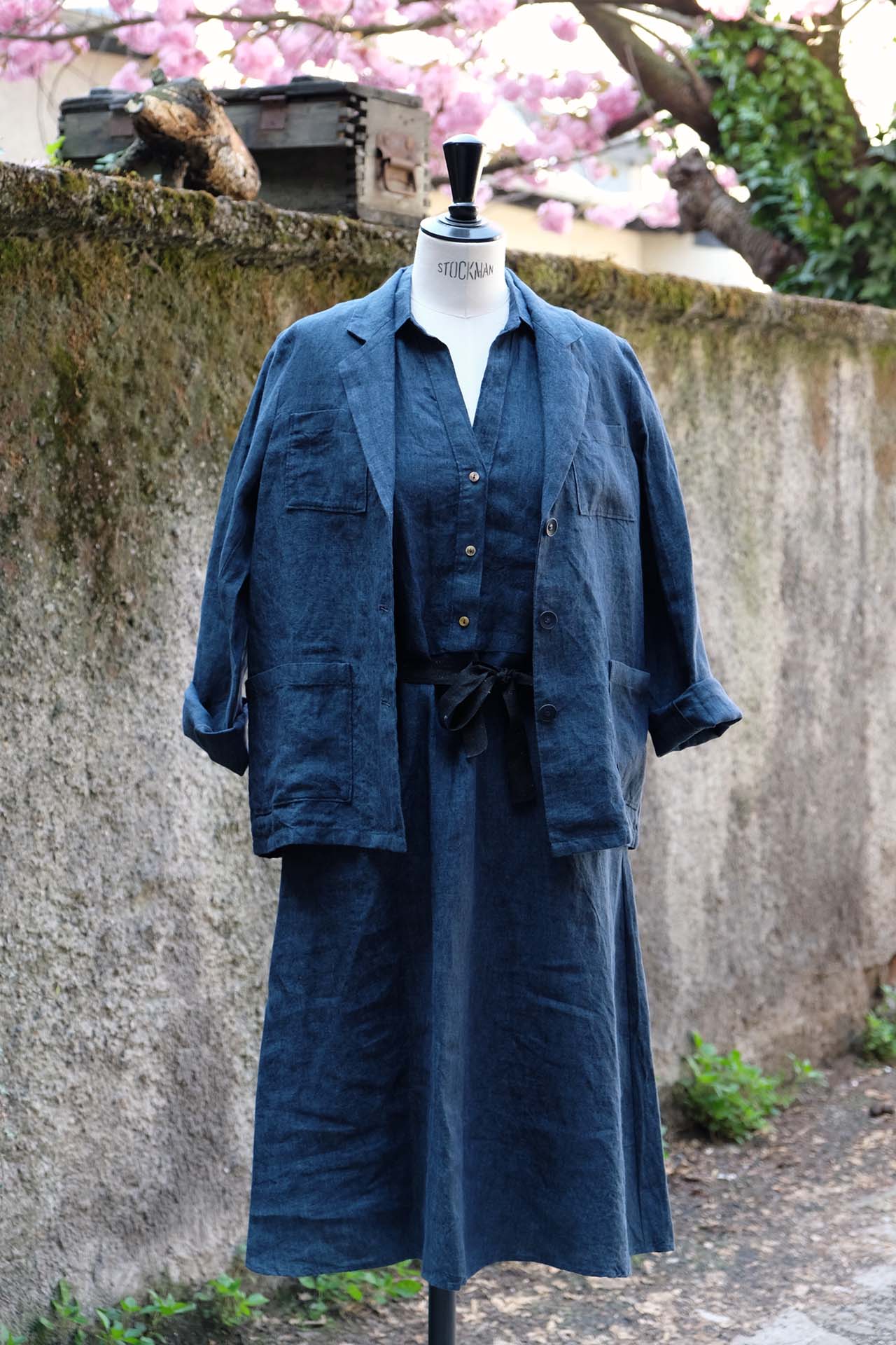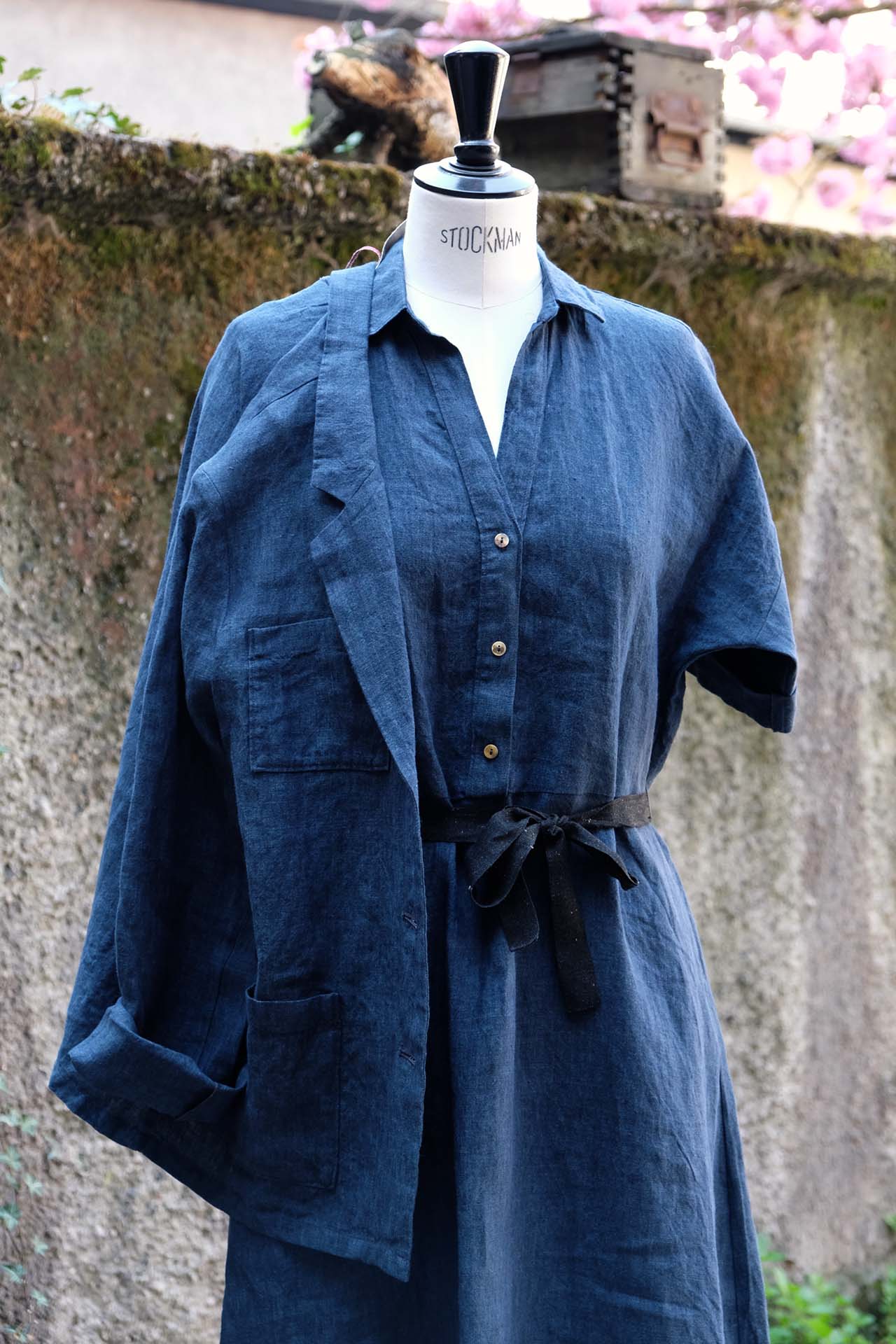 LÄSSIGES KLEID MIT DAZU PASSENDEM BLAZER AUS 100% LEINEN. IN DEN FARBEN INDIGO UND TABAK.