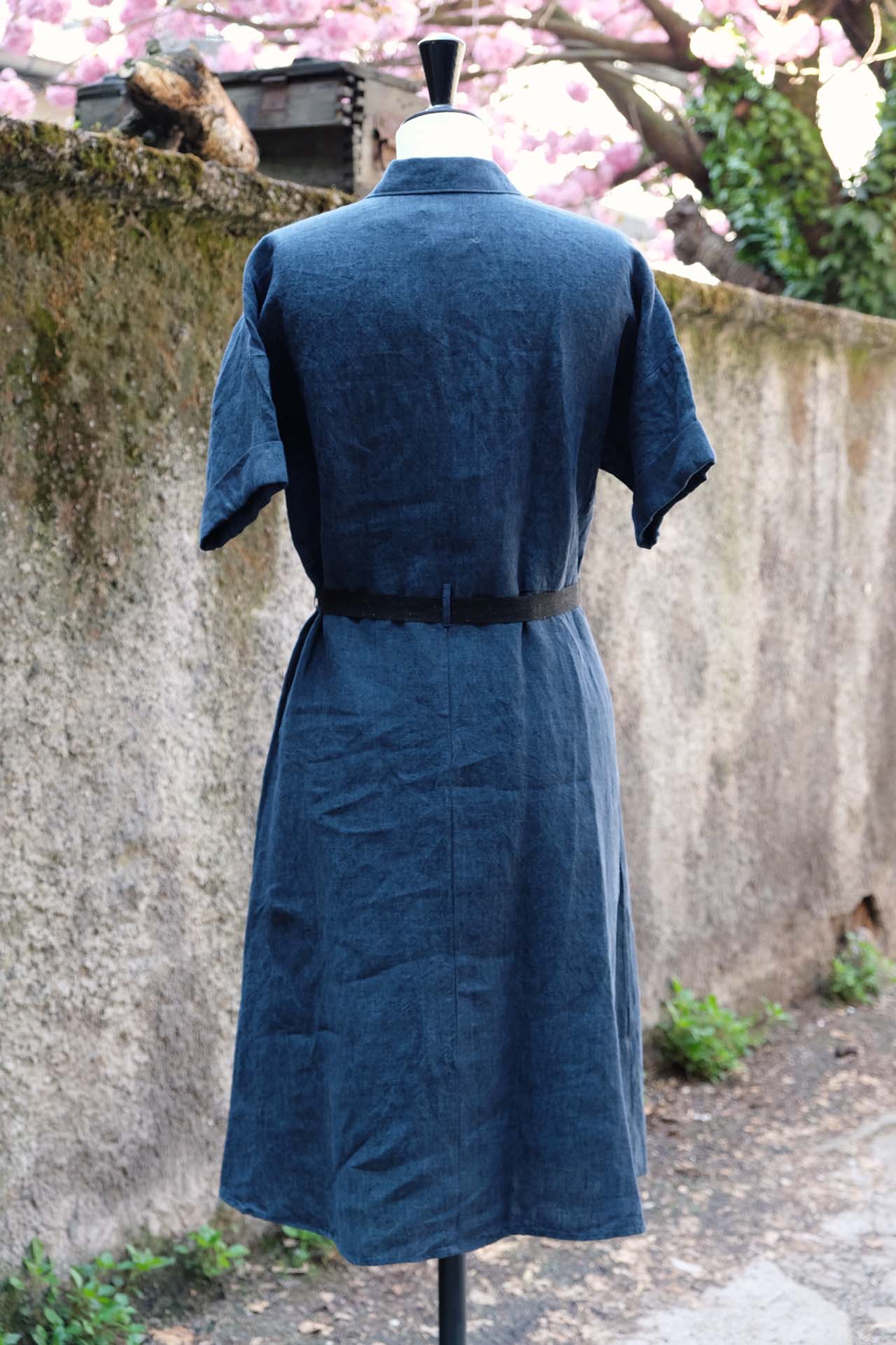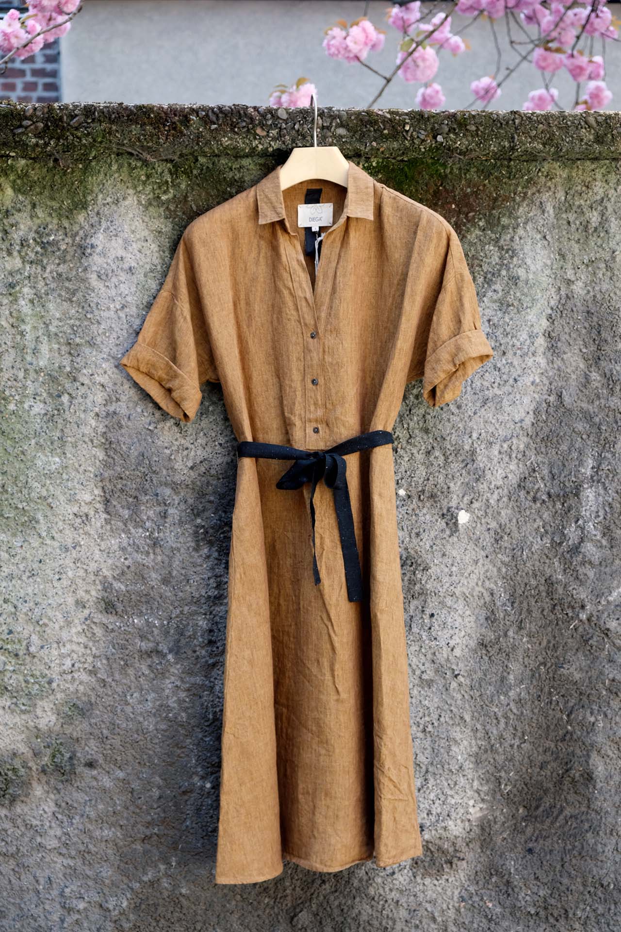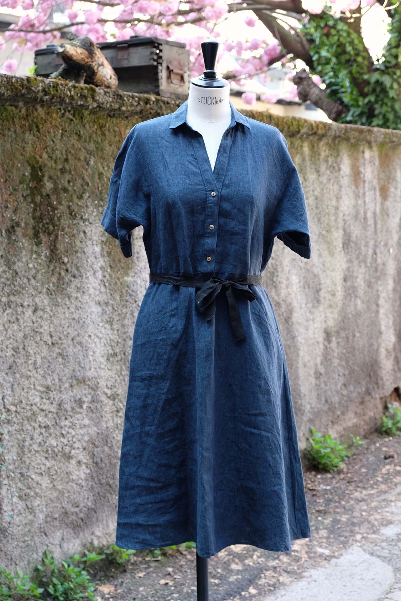 LÄSSIGES KLEID MIT DAZU PASSENDEM BLAZER AUS 100% LEINEN. IN DEN FARBEN INDIGO UND TABAK.