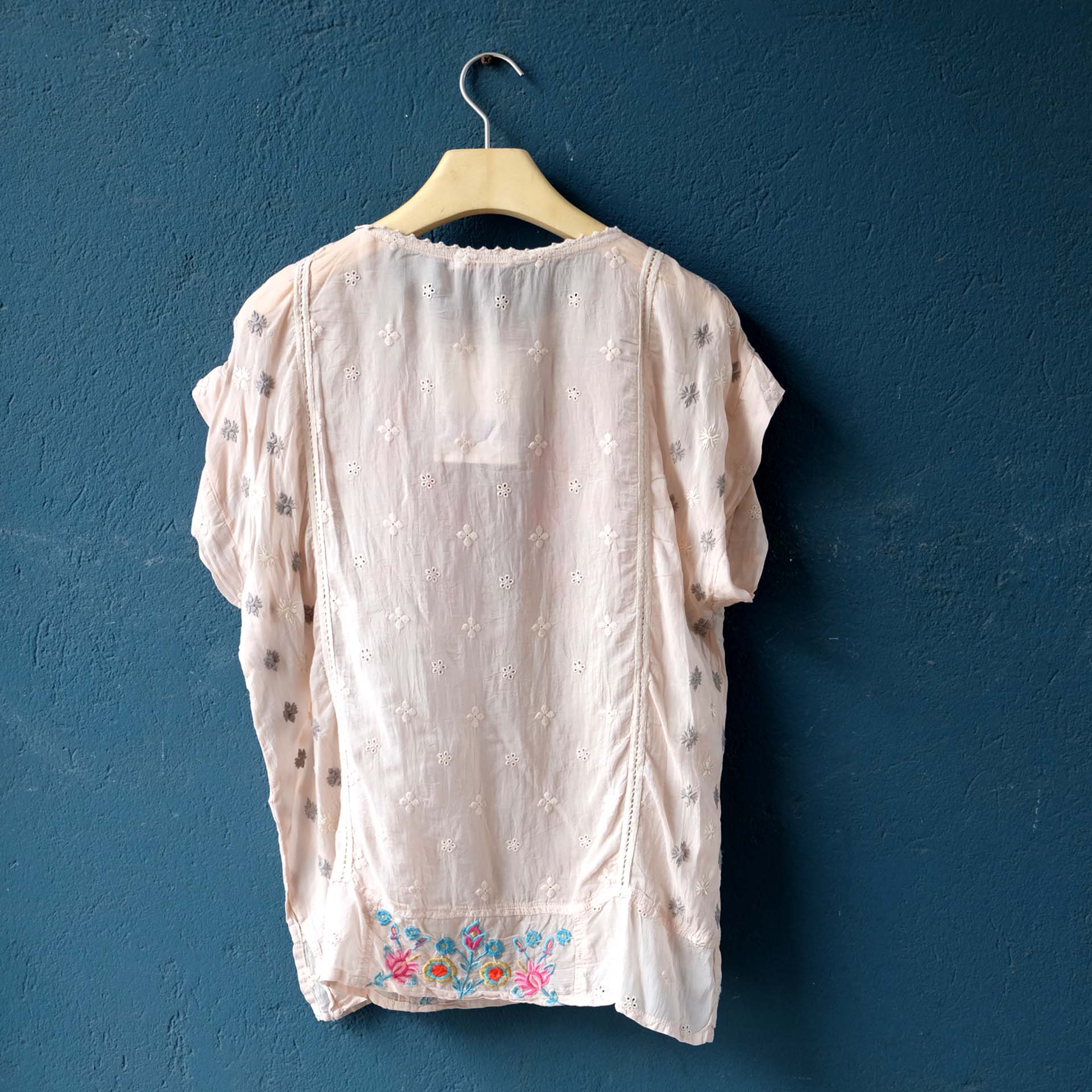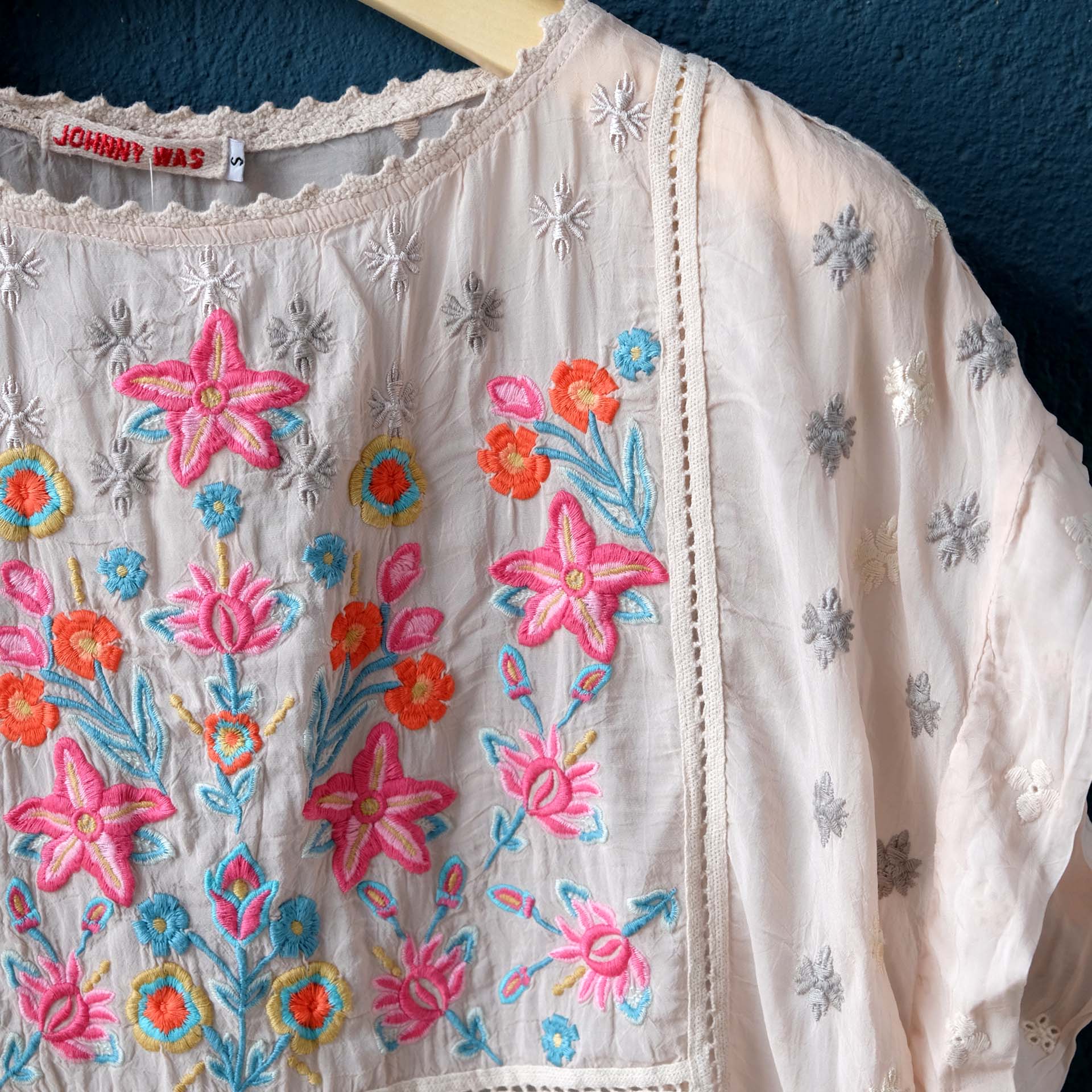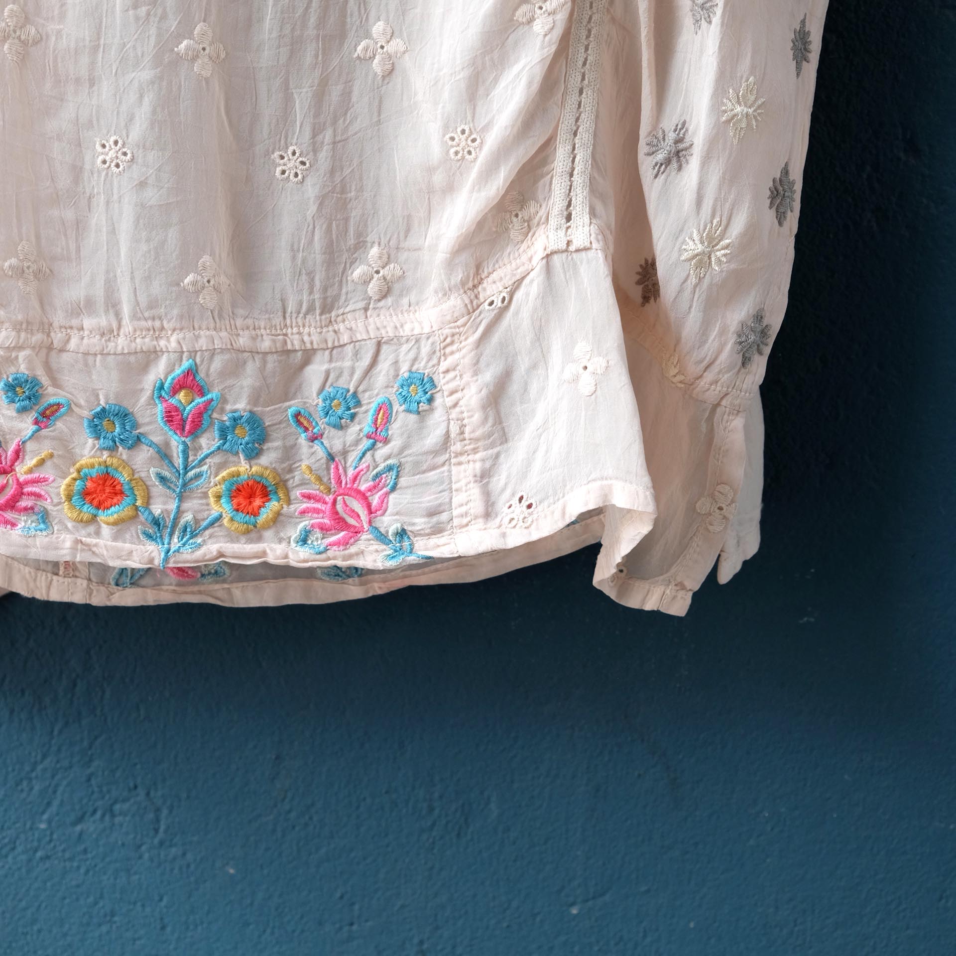 MIT EINER PRACHTVOLLEN PINK-TÜRKIS-ORANGEFARBENEN STICKEREI.