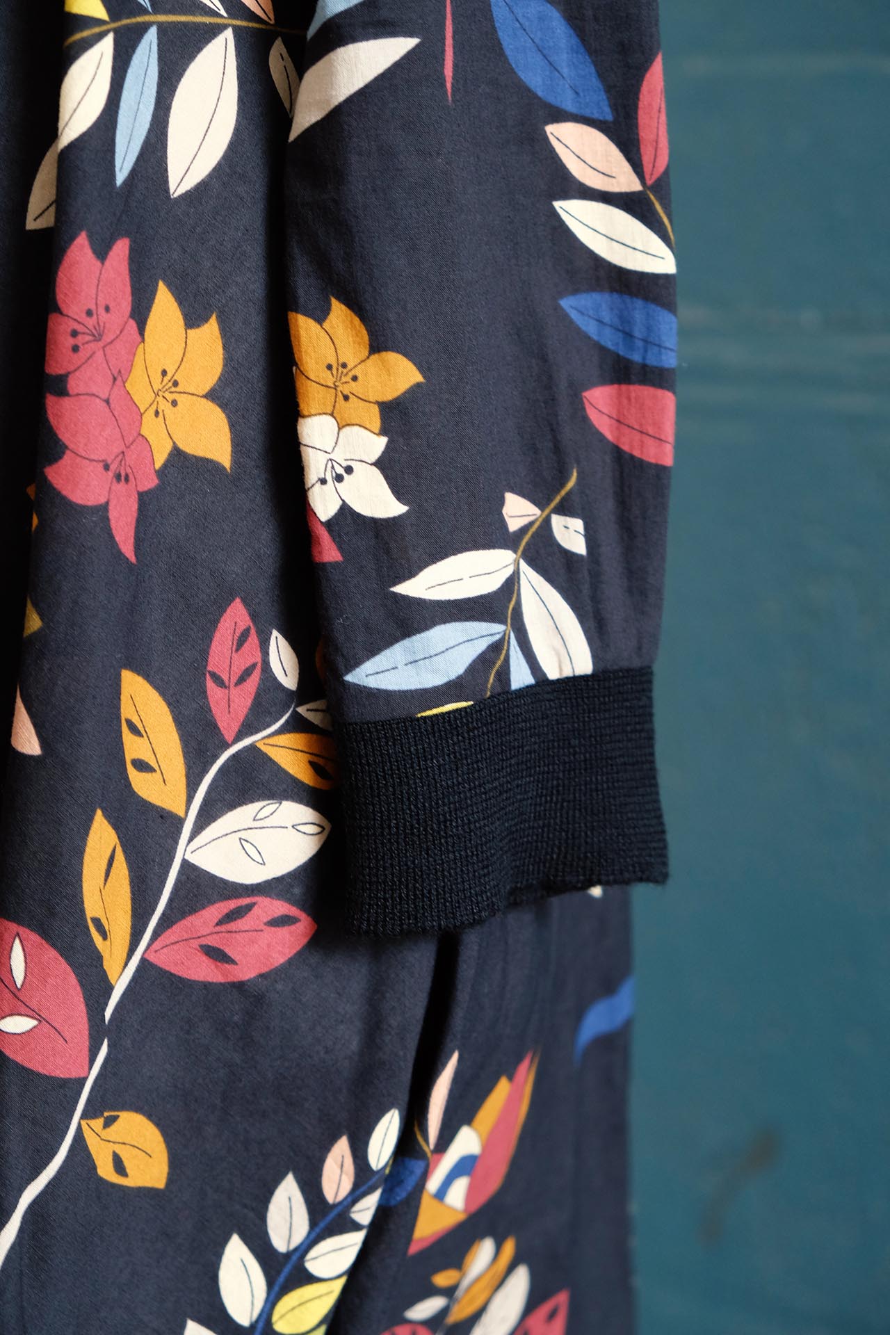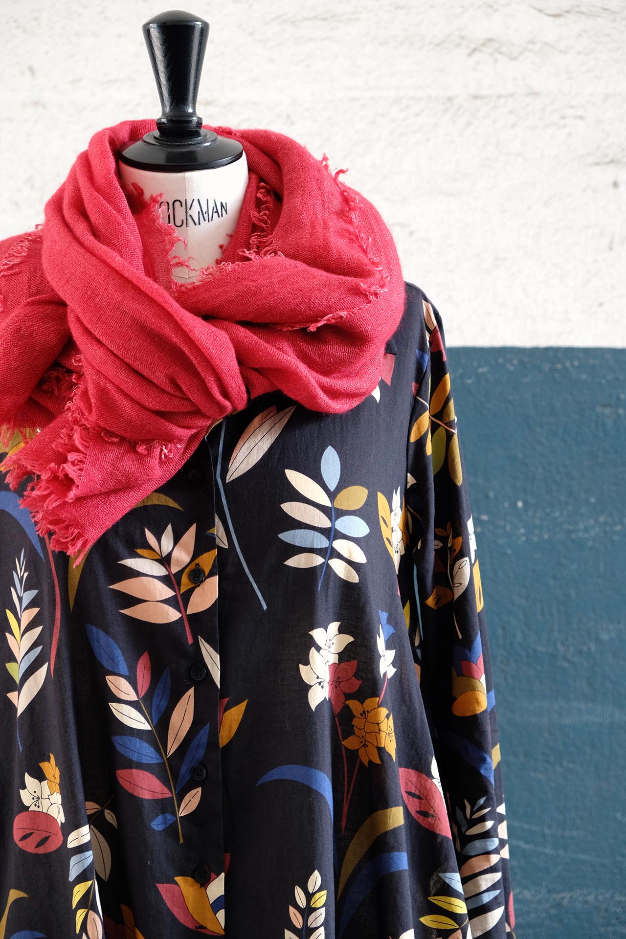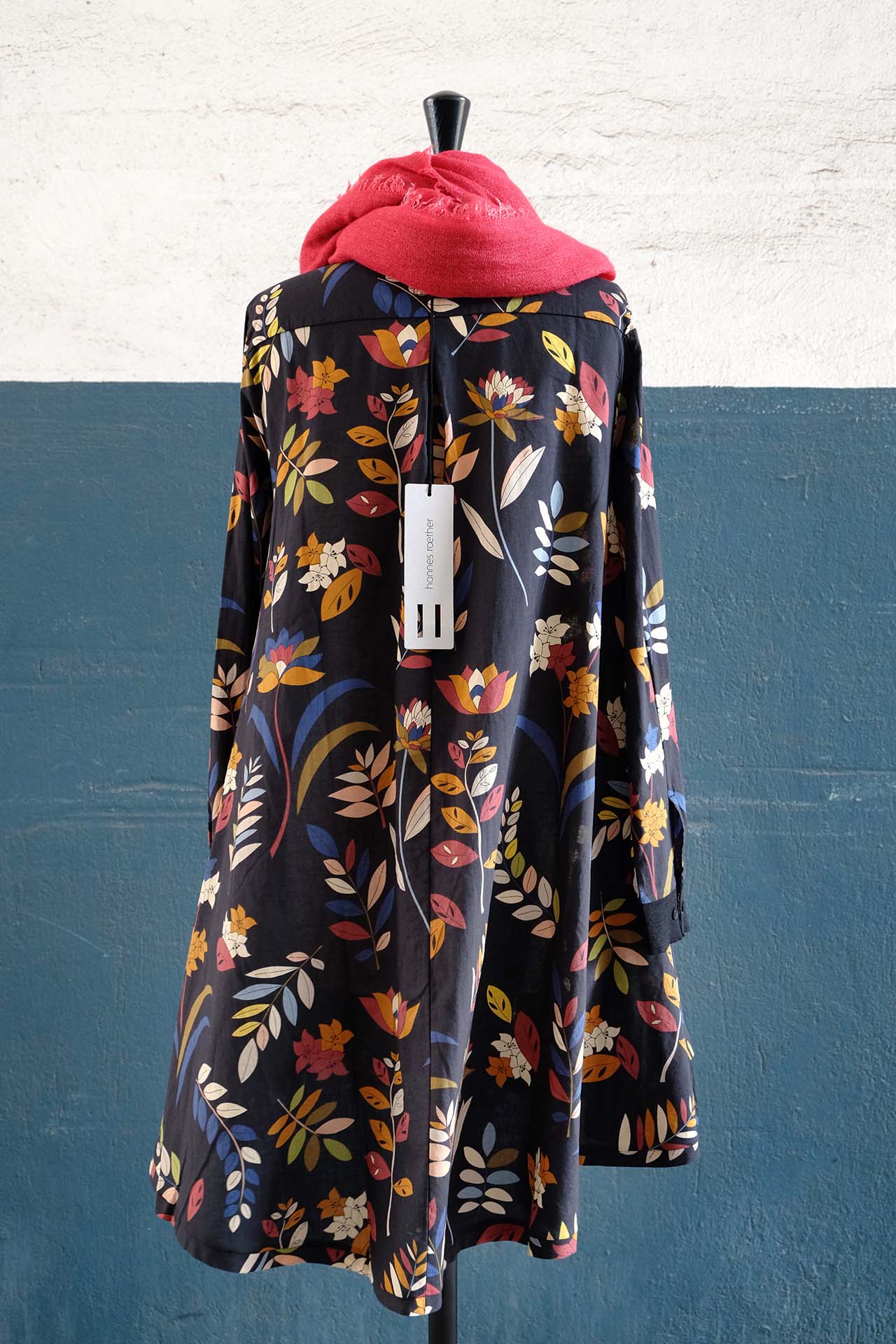 WEITSCHWINGENDES KLEID MIT HERBSTPRINT VON HANNES ROETHER. AUS 100% BAUMWOLLE UND MIT STRICKBÜNDCHEN AM ARM. KOMBINIERT MIT DEM TRAUMHAFT WEICHEN SCHAL VON FALIERO SARTI, AUS EINEM KASCHMIR- WOLLE- SEIDE MIX!