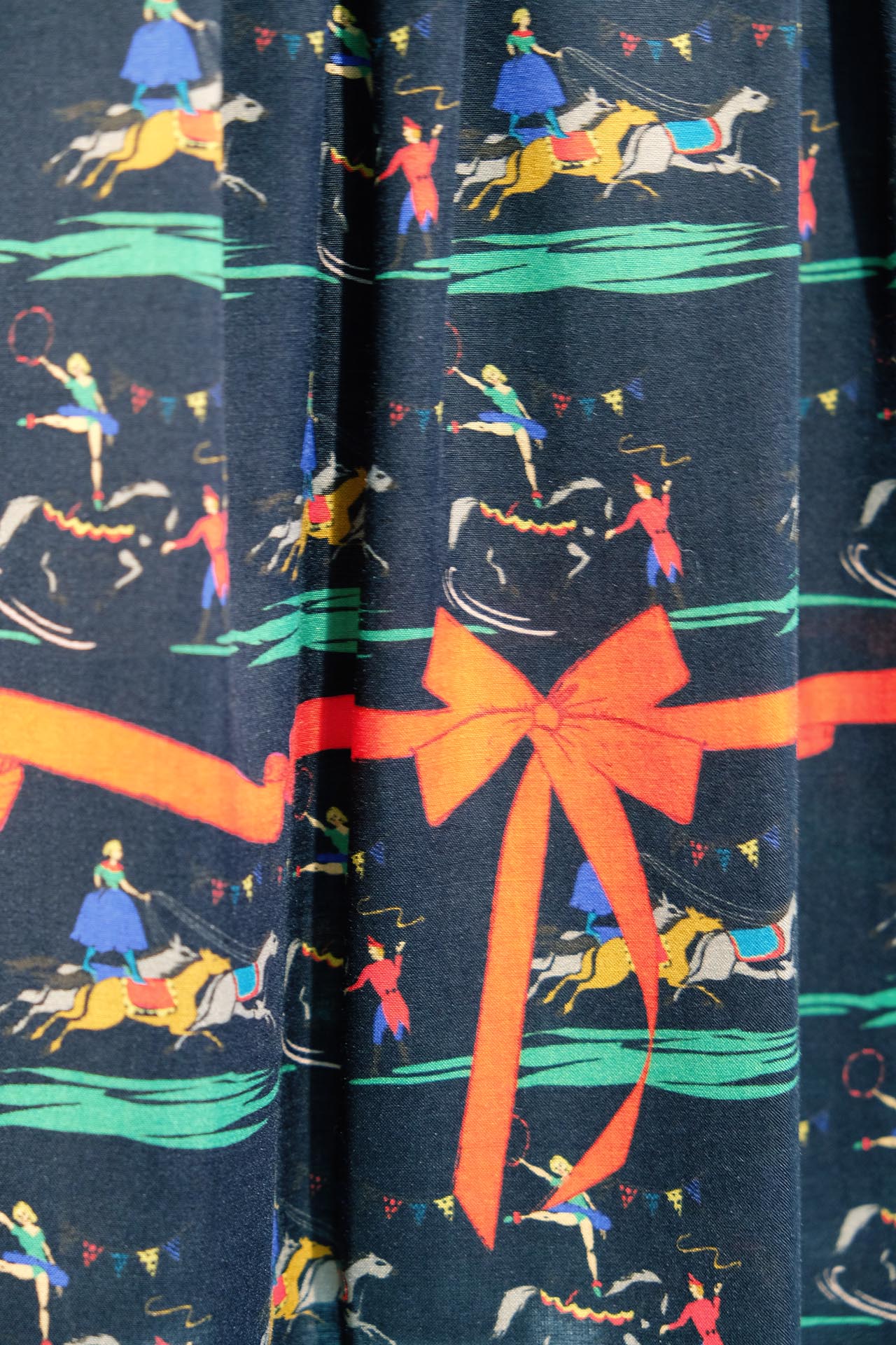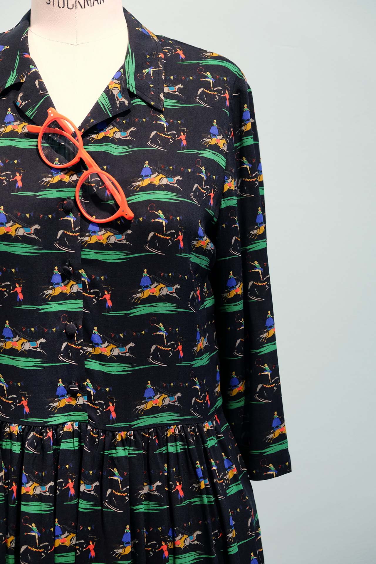 KLEID AUS 100% VISKOSE MIT EINEM REITERPRINT, PASSEND DAZU DIE LESEBRILLE VON IZIPIZI IN DER SONDERFARBE ORNAGE PUMPKIN.
