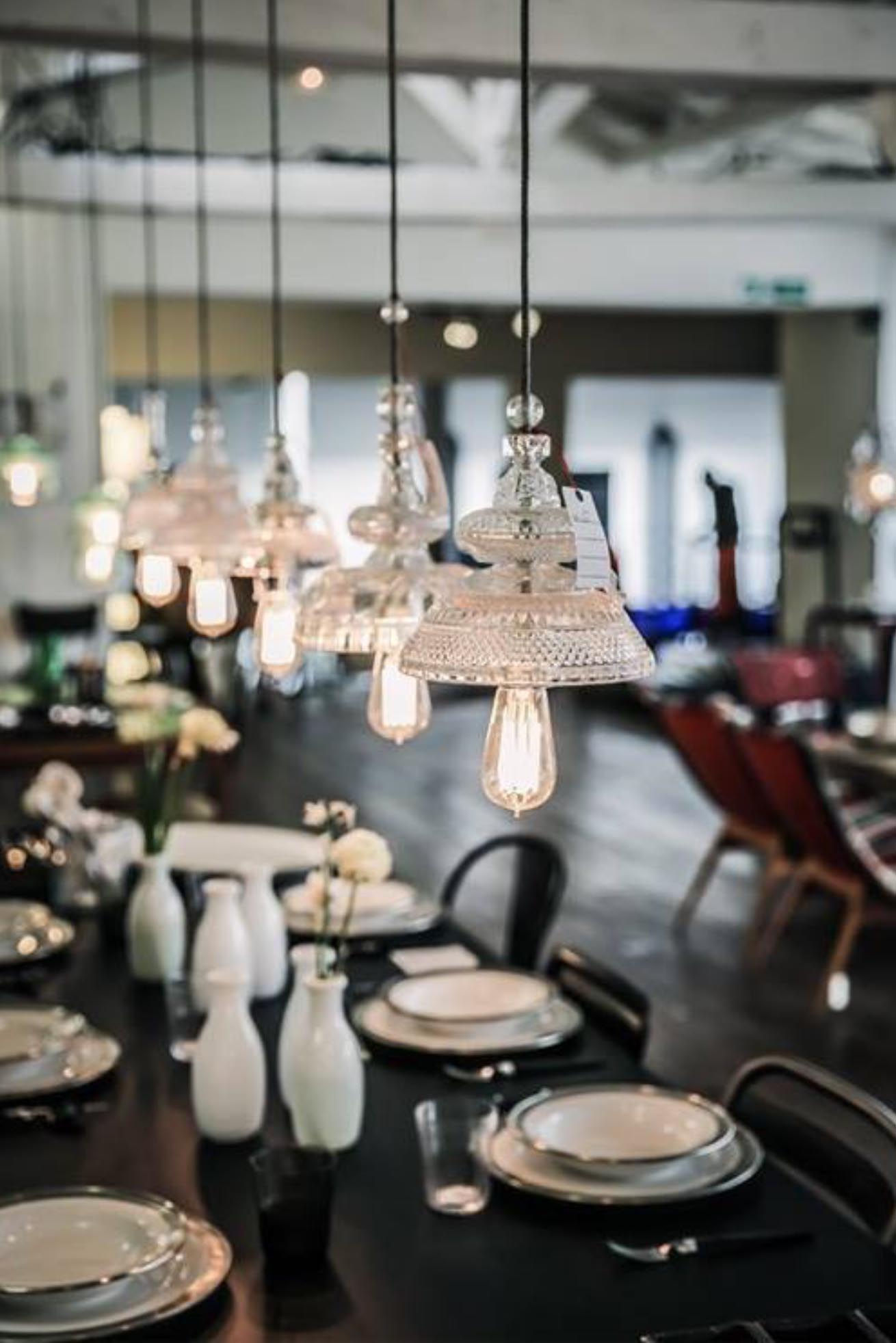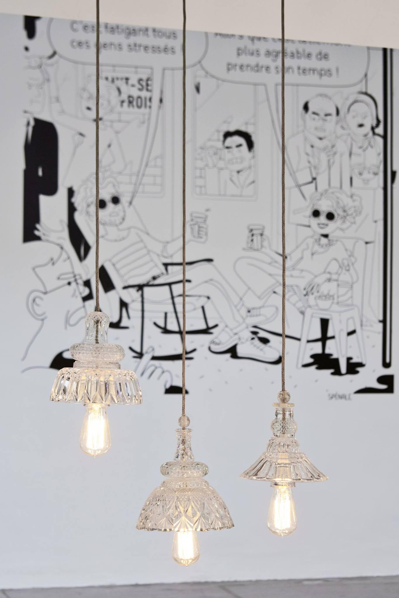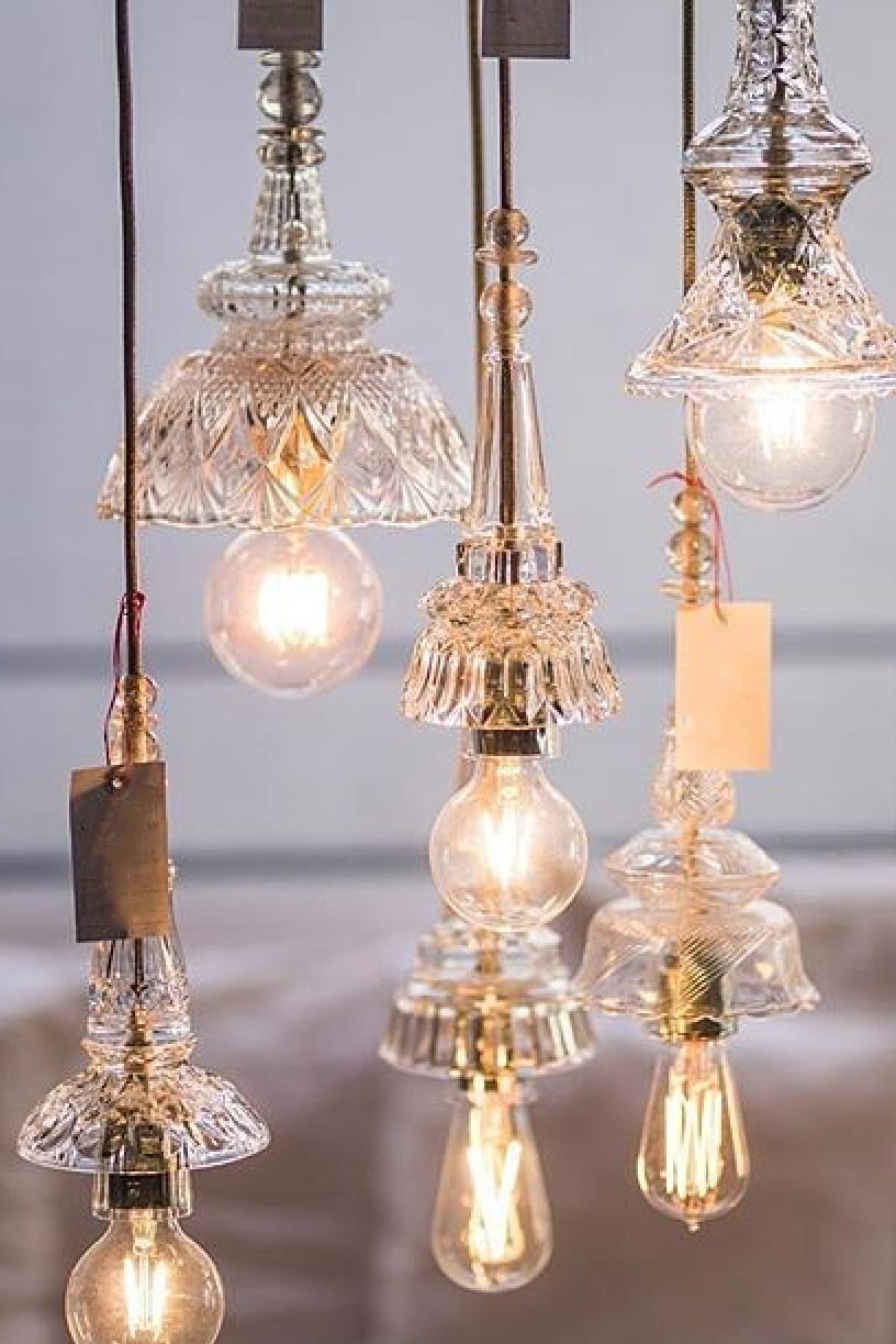 BUFFET DE GRANNY A-D AUS VINTAGE KRISTALLSCHALEN MIT 3 METER LANGEM SCHMUCKKABEL UND KRISTALL-BALDACHIN. JEDE LAMPE IST EIN UNIKAT VOLLER CHARM UND SEELE!!