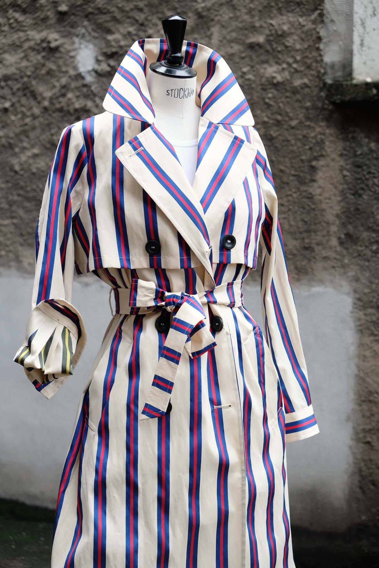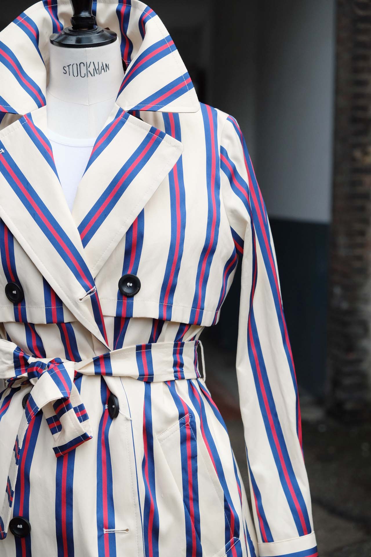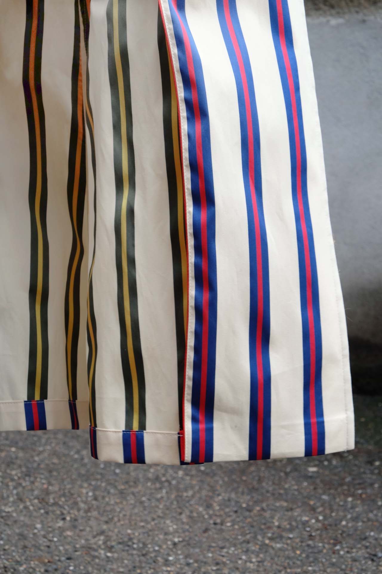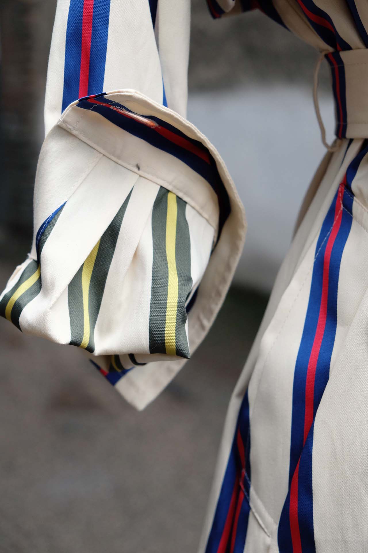 ZAUBER-TRENCHCOAT VON LOST IN ME MIT AUSSEN ROT-BLAUEN MARKISENSTREIFEN UND INNEN GELB-GRÜNEN STREIFEN. DER TRENCH HAT EIN UNGLAUBLICHES INNENLEBEN, MANSCHETTEN UND EINEN BINDEGÜRTEL.