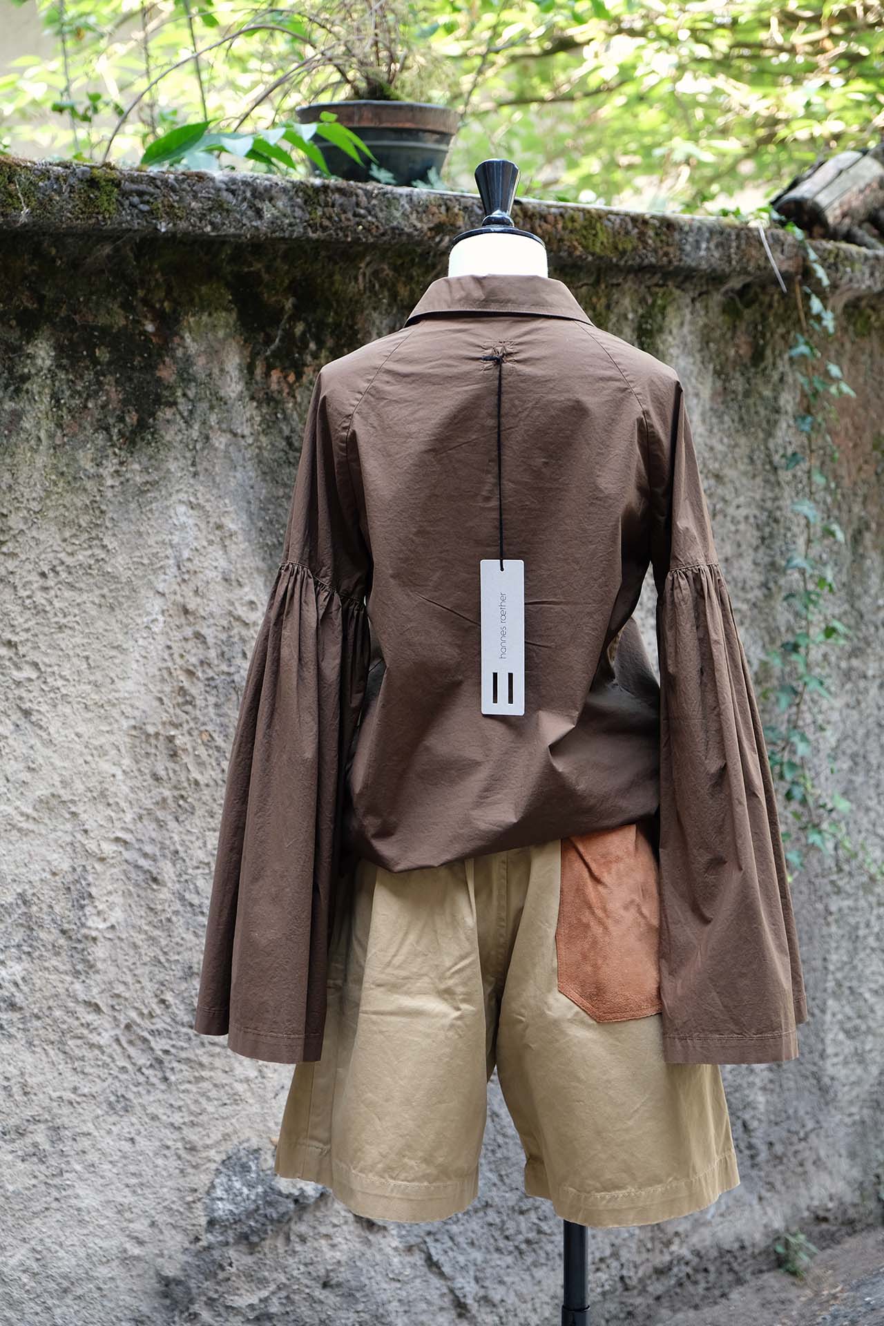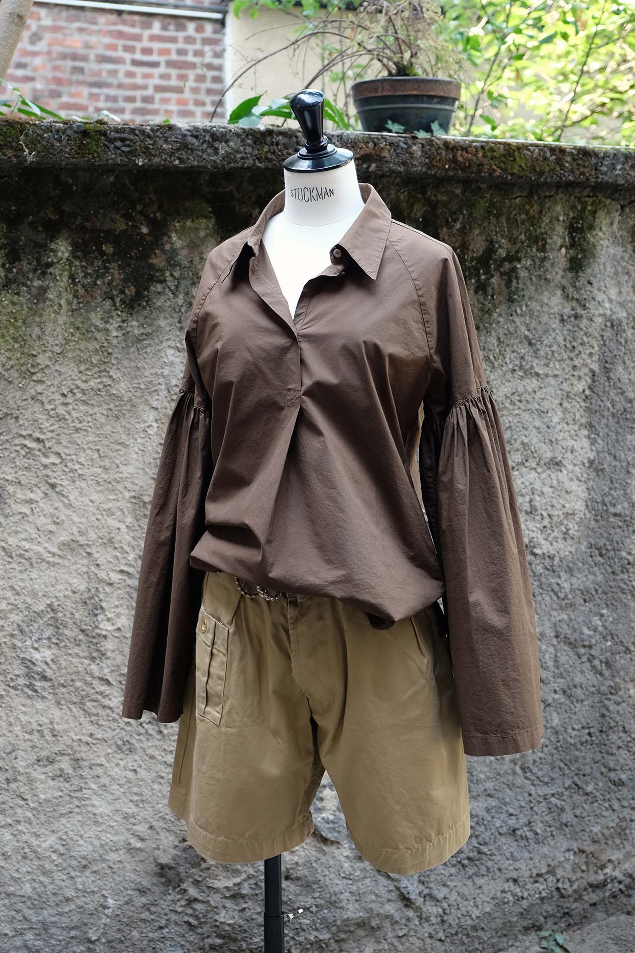 BAUMWOLLBLUSE MIT WEIT AUSGESTELLTEM SCHMUCKARM VON HANNES ROETHER KOMBINIERT MIT DER INTERBRIGADE SHORT MIT RÜCKWÄRTIGER LEDERTASCHE.