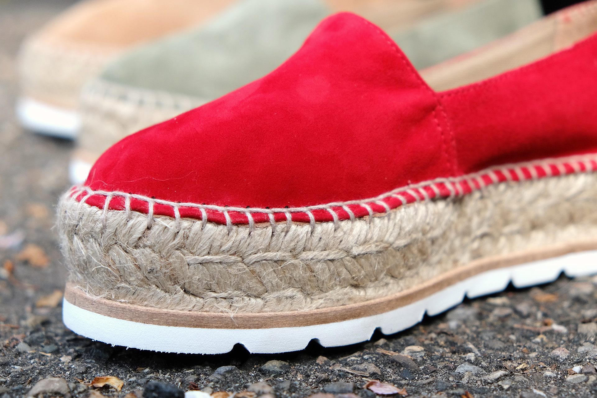 HANDGEFERTIGTE, SUPER BEQUEME PLATEAU - ESPADRILLES VON GAIMO. DEN WILDLEDERSCHUH GIBT ES IN DEN SOMMERLICHEN FARBEN CARMESI, OLIVIO UND CAMEL.
