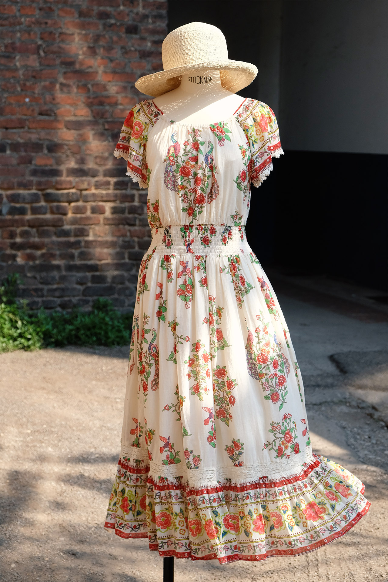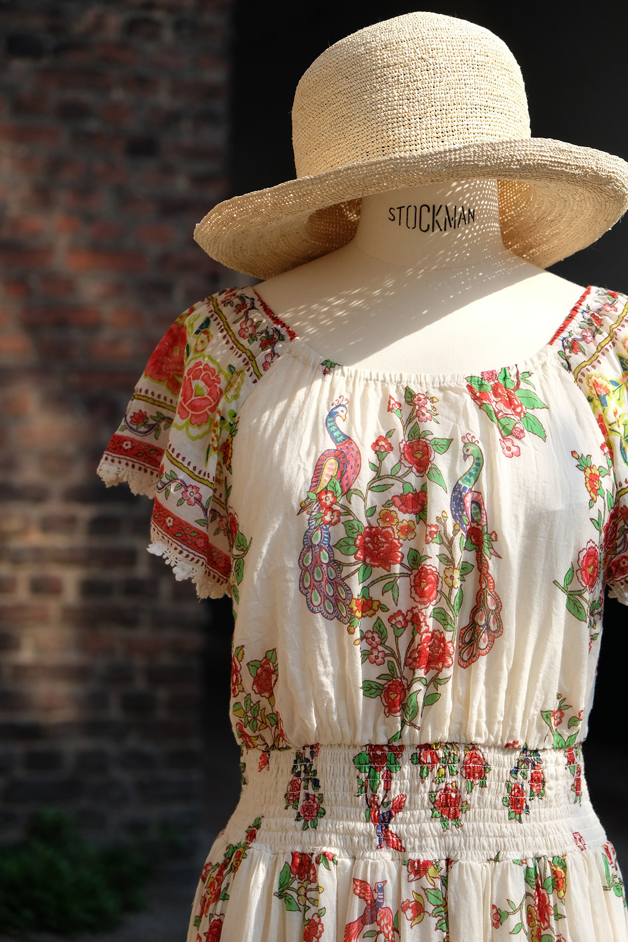 ROMANTISCHES SOMMERKLEID AUS 100% BAUMWOLLE. MIT DEM CARMEN-AUSSCHNITT LÄSST ES SICH AUCH SEHR SCHÖN SCHULTERFREI TRAGEN. PERFEKT DAZU: DER SOMMERHUT VON SCHA AUS KÖLN.