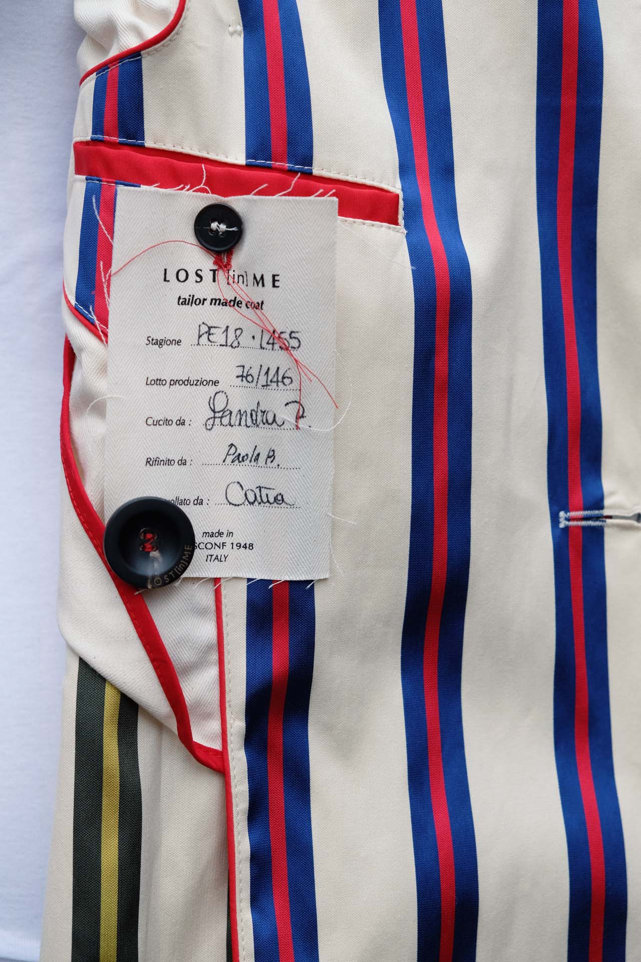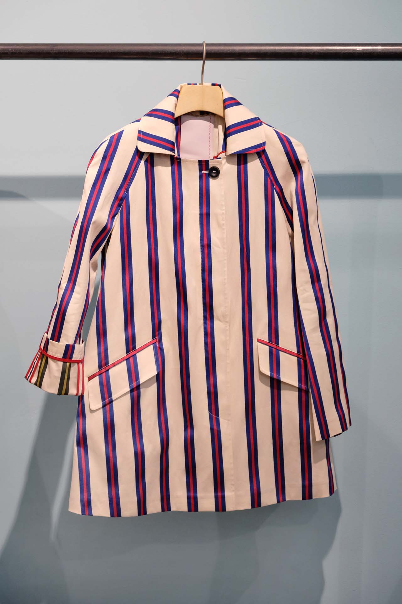 DER ROT-BLAUE MARKISENSTREIFEN WANDELT SICH IM INNEREN DER JACKE IN EINEN GRÜN-GELBEN STREIFEN.