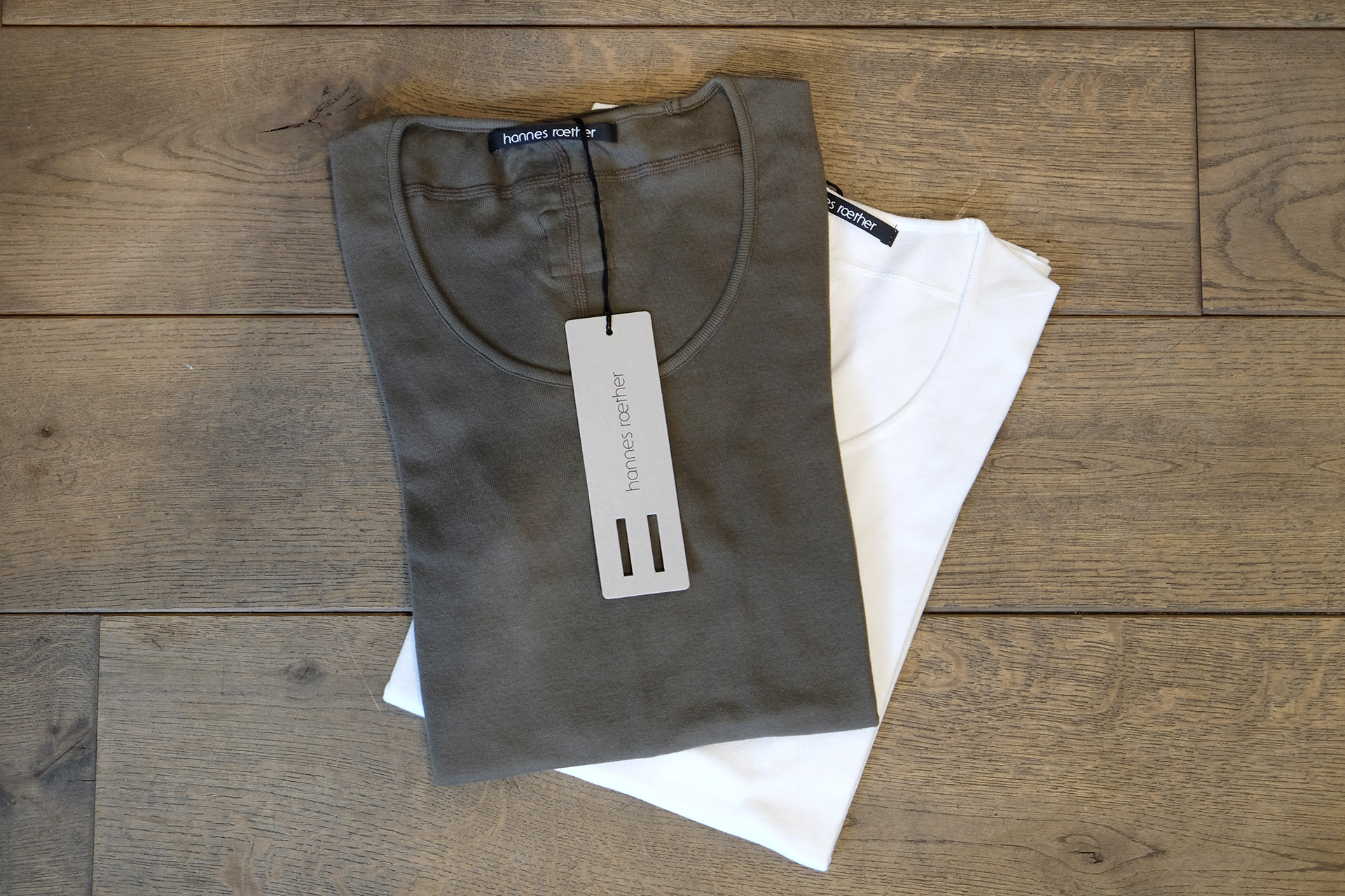 EIN BAUMWOLL-SHIRT VON HANNES ROETHER MIT EINEM ETWAS LÄNGEREN ARM. SCHÖNE DETAILS, WIE GESCHNITTENE KANTEN UND INTERESSANTE TEILUNGSNÄHTE, BESTÜCKEN ES. WIR HABEN ES IN DEN FARBEN WEISS UND KHAKI.
