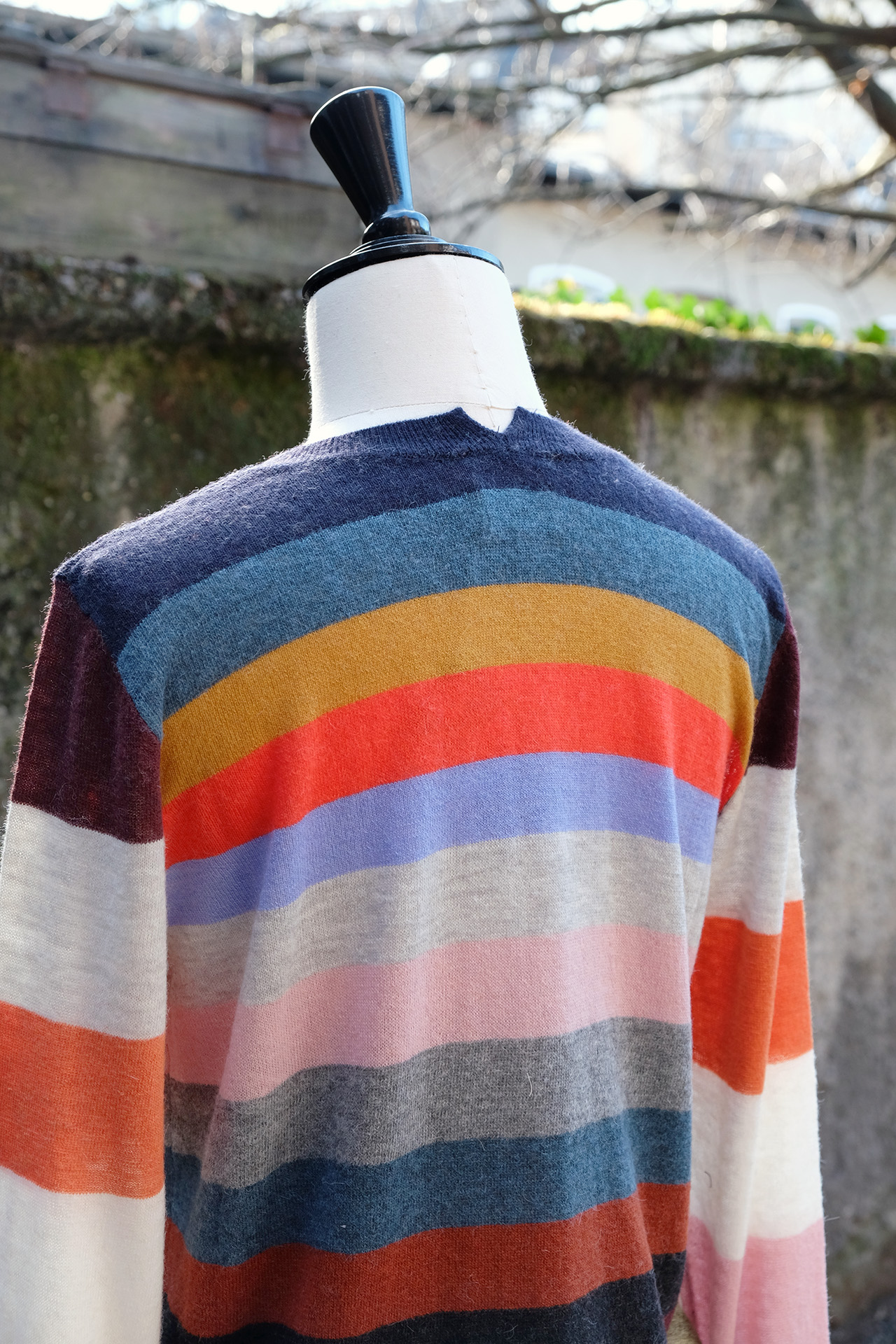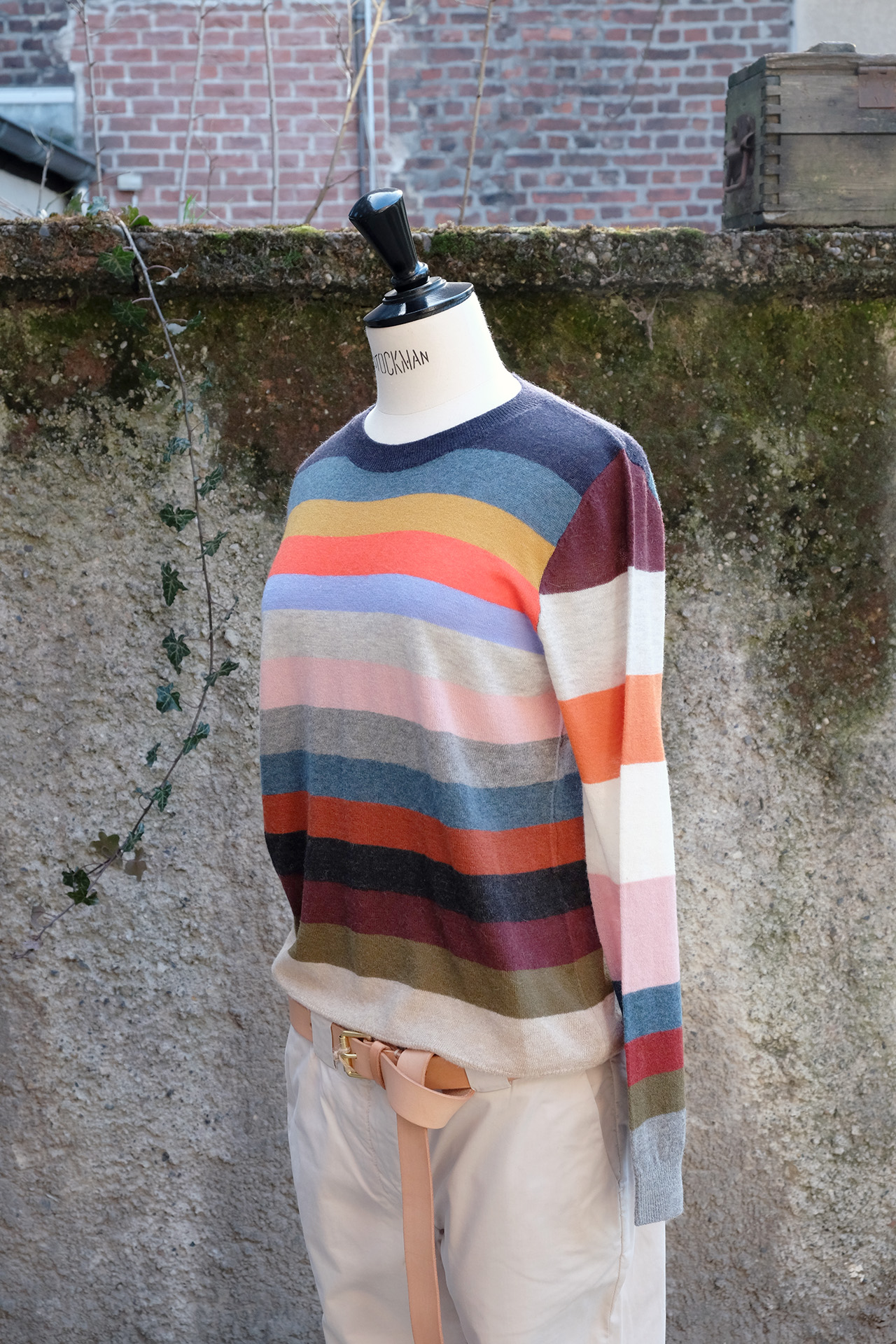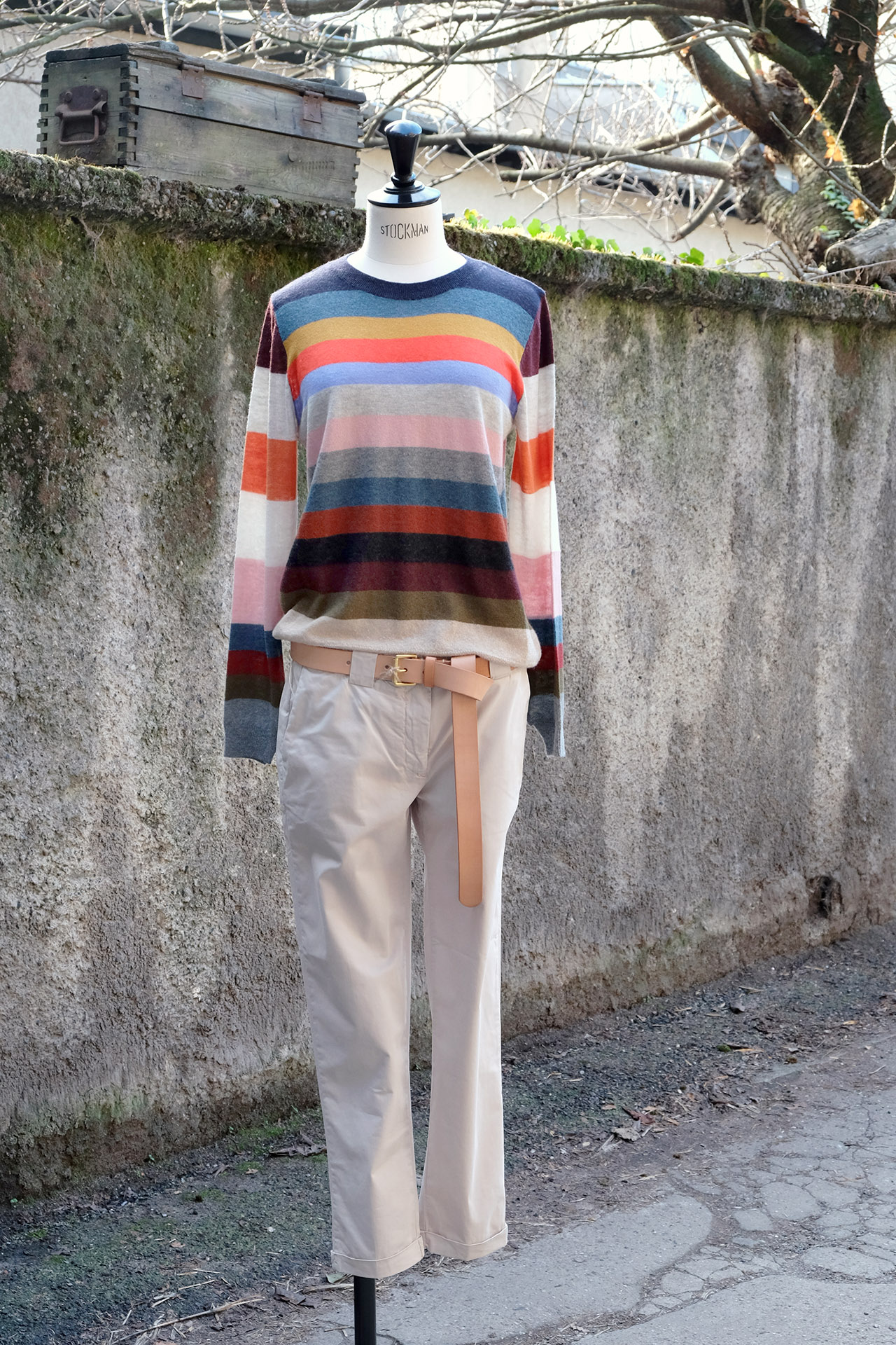 FRÖHLICHER STREIFENPULLI VON BELLEROSE AUS EINEM MIX AUS BABY-ALPAKA UND EXTRA FEINER WOLLE. KOMBINIERT MIT DER FRÜHLINGS CHINO VON MYTHS. DER NATURBELASSENE LEDERGÜRTEL VON TIMELESS RUNDET DAS OUTFIT AB!