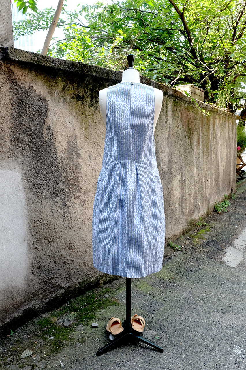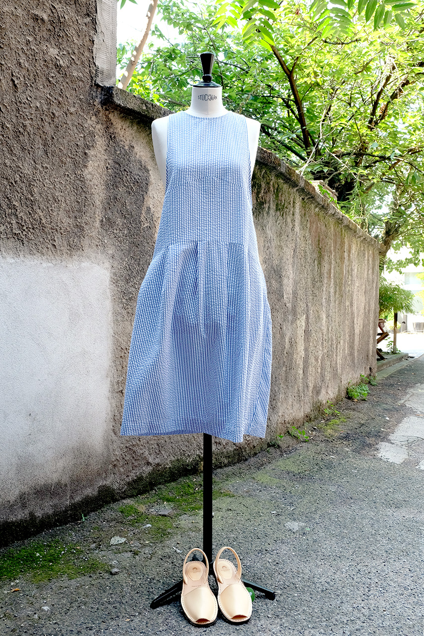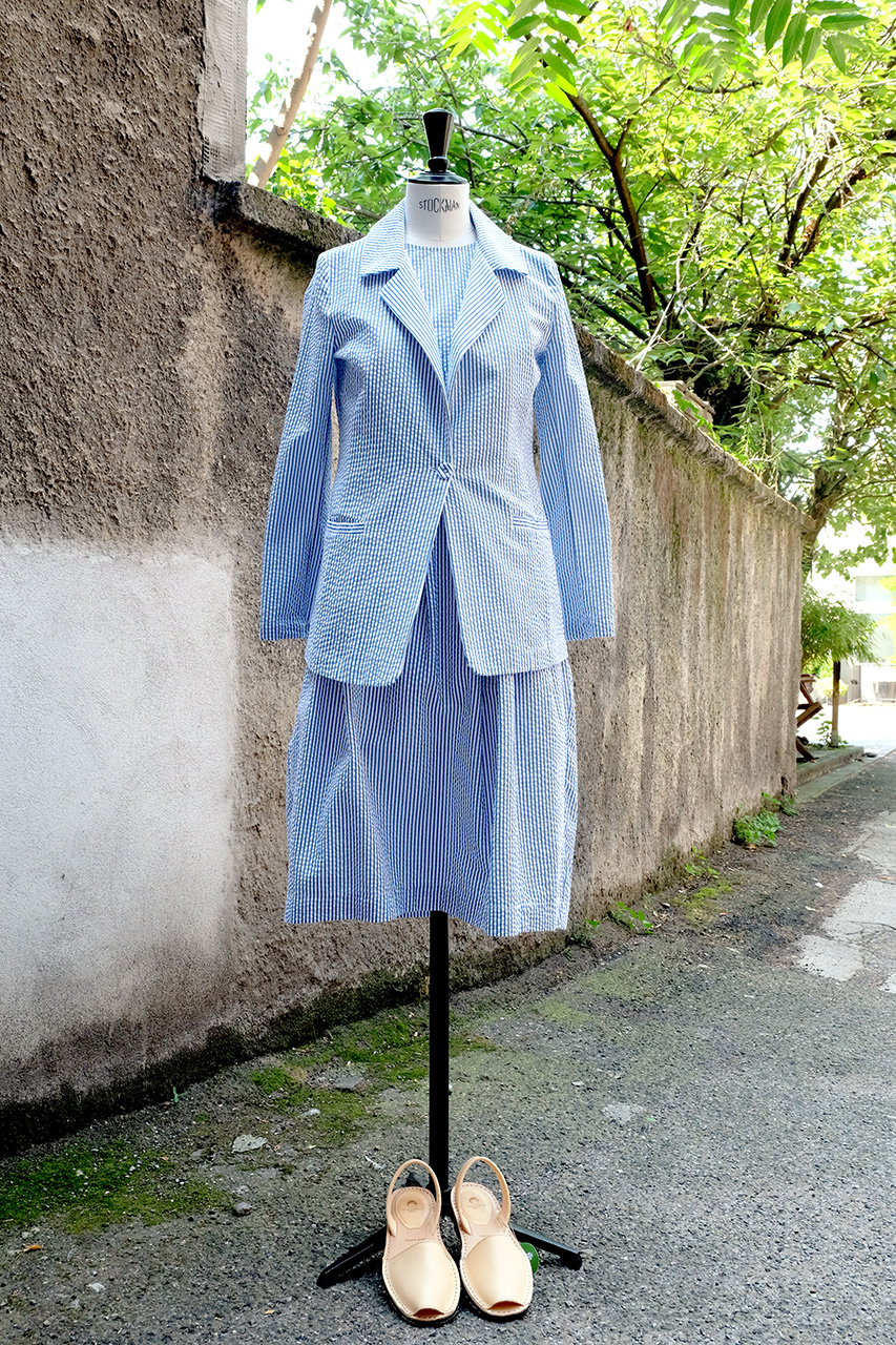 Das seersucker Kleid und der passende Blazer von dem Label Souvenir Clubbing sind mit feinen weißen und hellblauen Streifen besetzt. Schick und elegant!