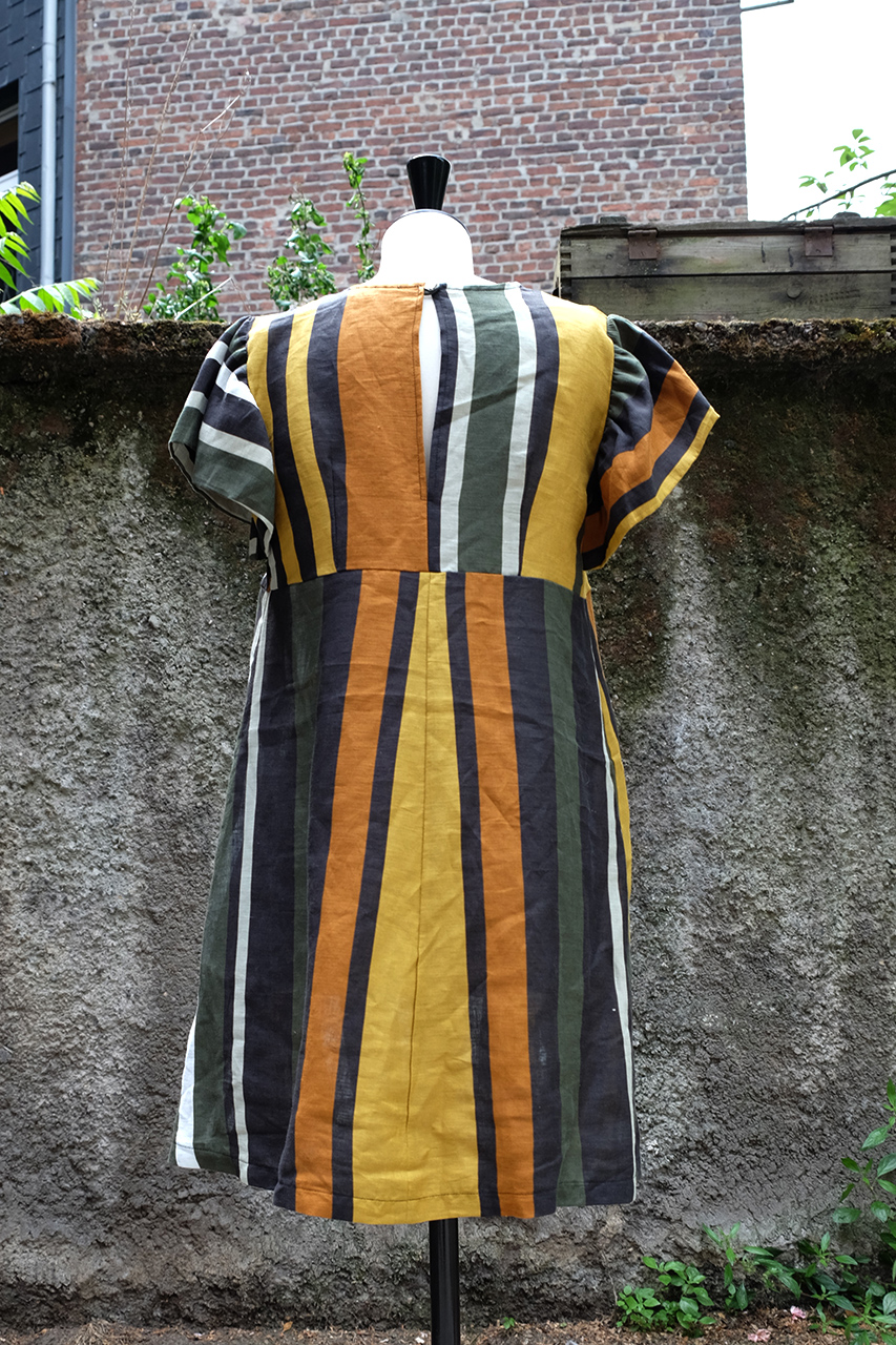 Das bunt gestreifte Kleid von dem italienischen Label Motel fällt locker und leicht. Der Leinenstoff lässt sich besonders an warmen Tagen angenehm auf der Haut tragen.