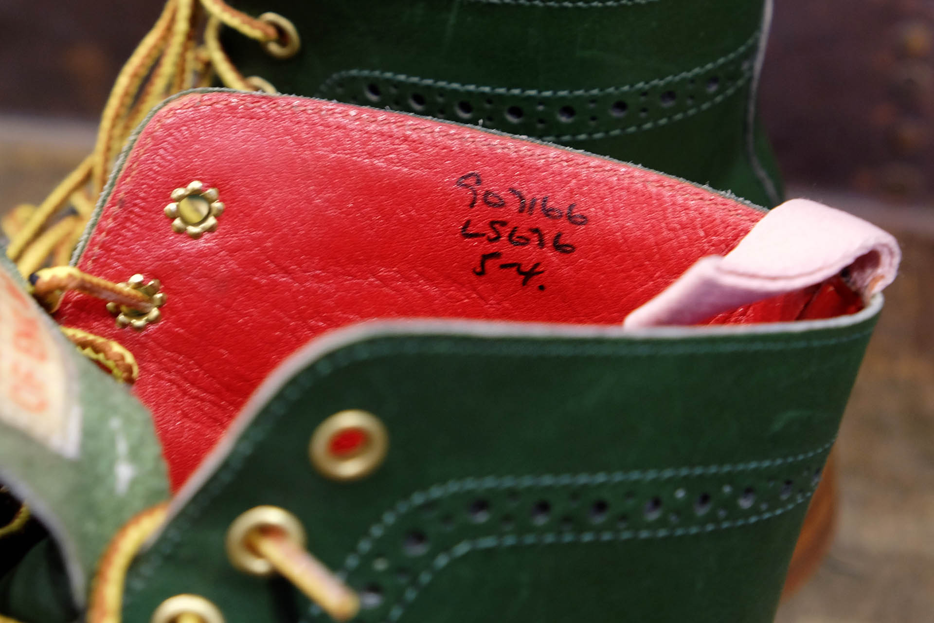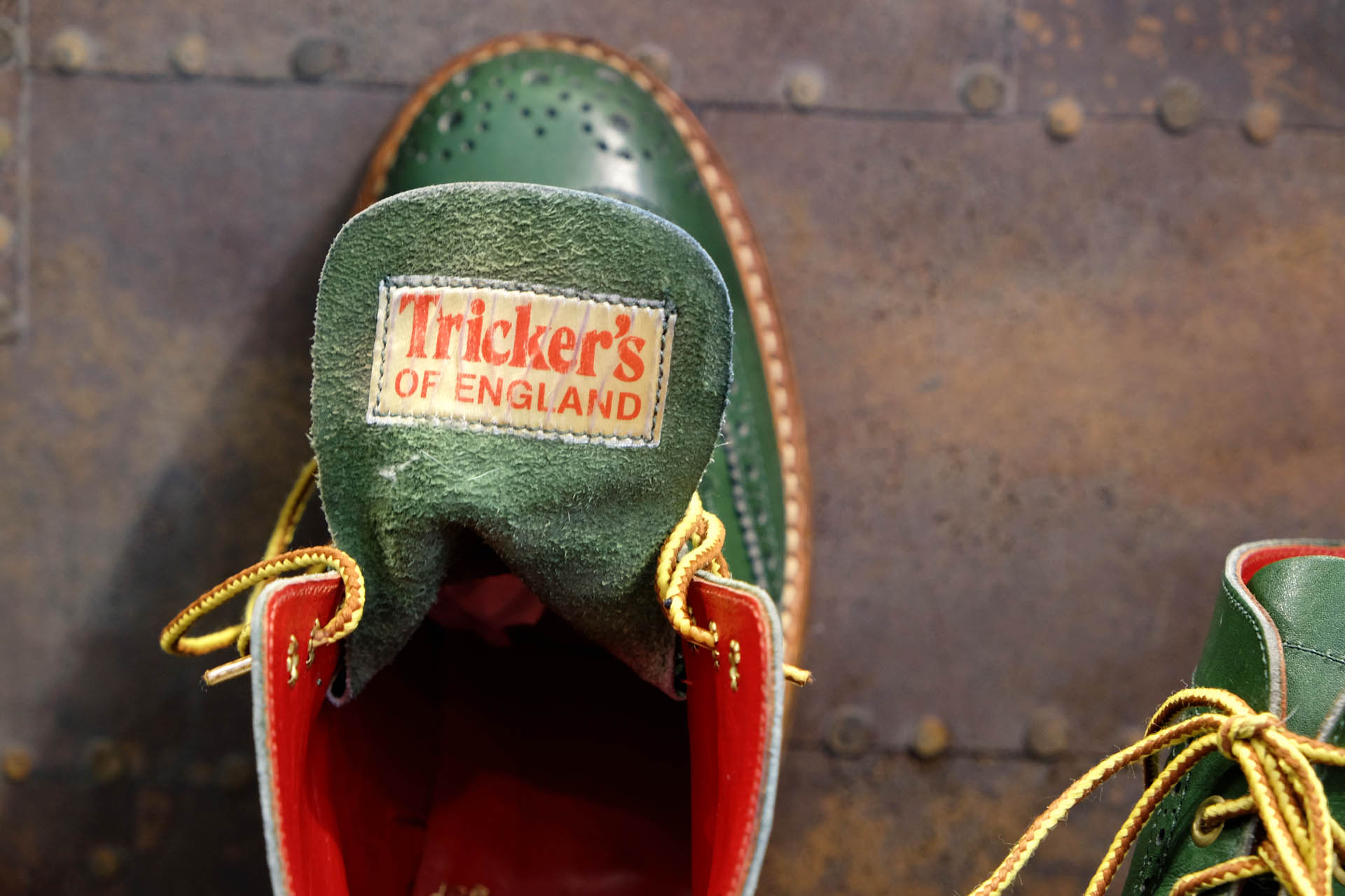 EINZELSTÜCK AUS FOTOSHOOTING. TRICKER'S MIT DAINAITE SOHLE IN BRITISH RACING GREEN MIT LEDERINNENFUTTER UND ROSA LASCHE.