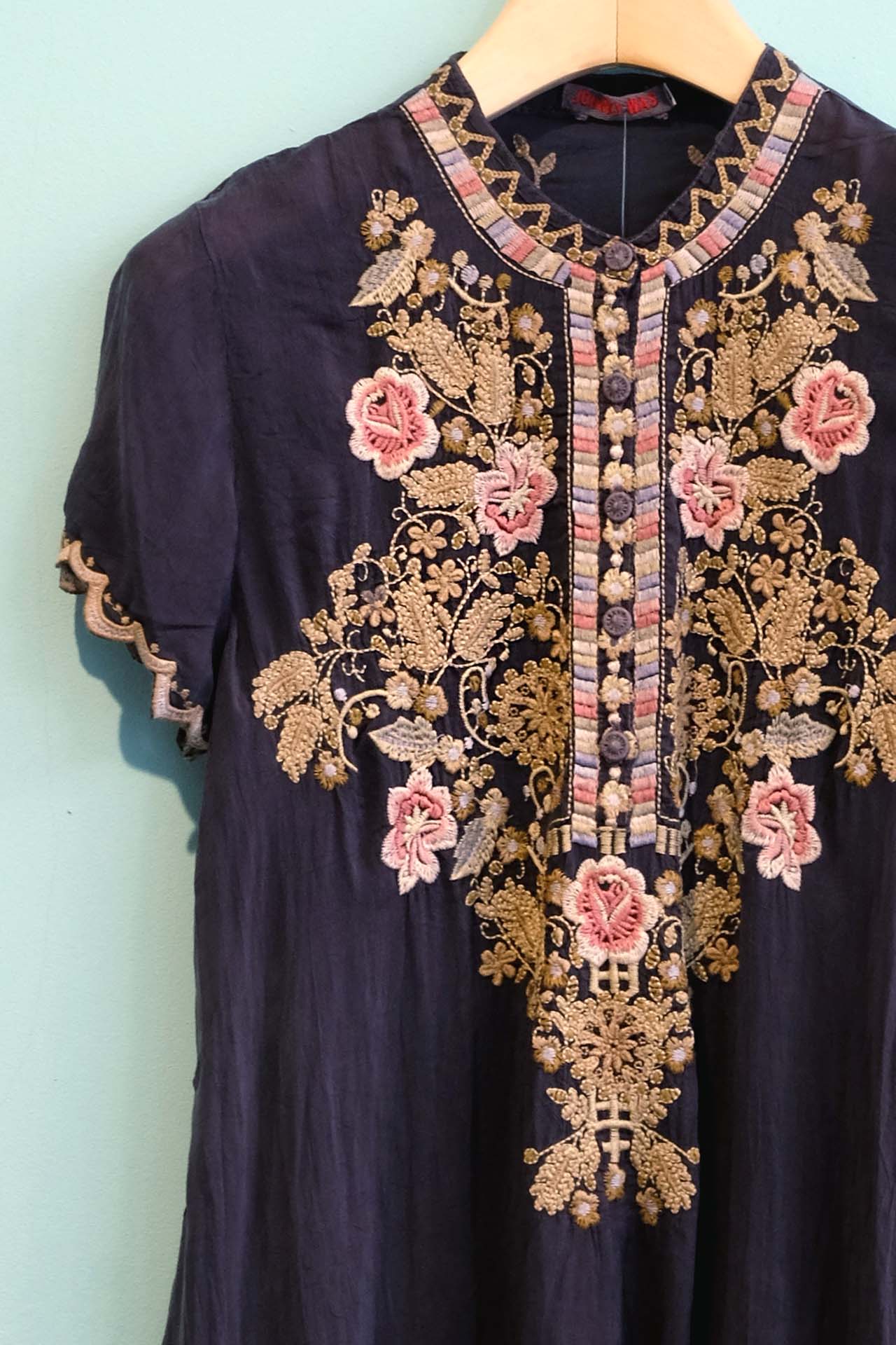 ROMANTISCHE TUNIKA VON JOHNNY WAS IN GRAPHIT. DIE TUNIKA BESTICHT MIT EINER PRACHTVOLLEN, AUFWENDIGEN BLUMENSTICKEREI UND VIELEN SCHÖNEN DETAILS.