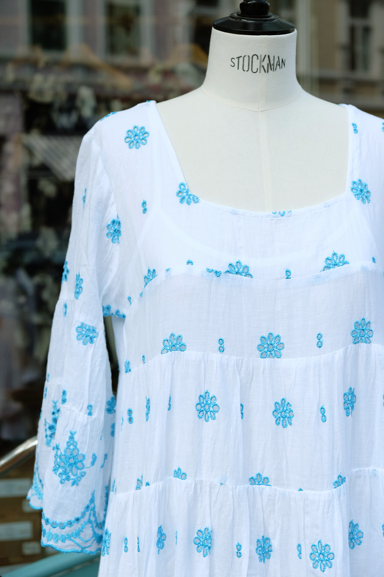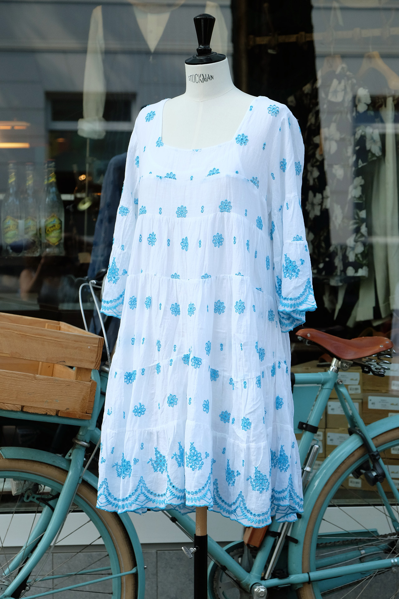 WEISSES SOMMERKLEID MIT TÜRKISER HOHLSAUMSTICKEREI VON PEACE AND LOVE.