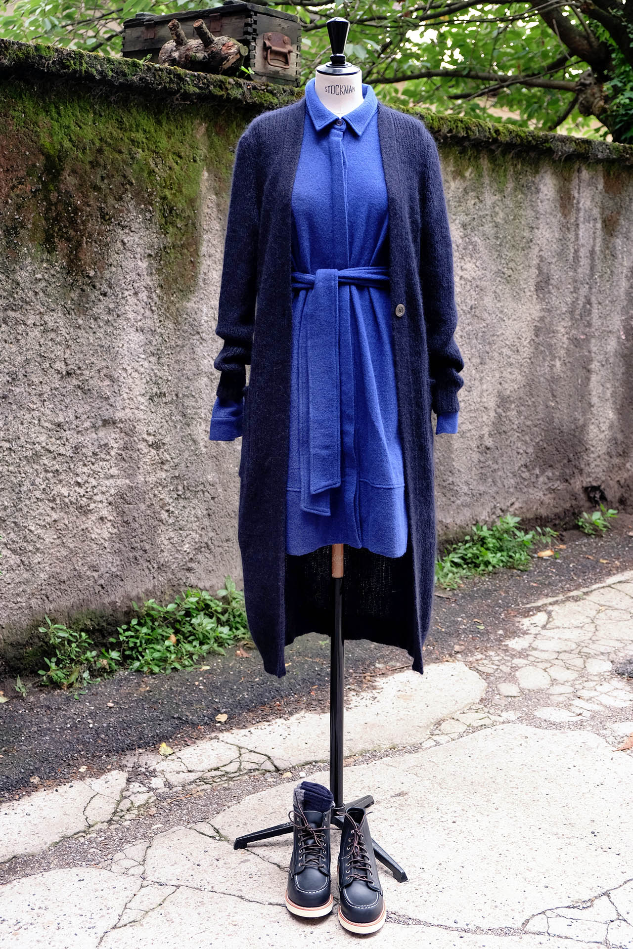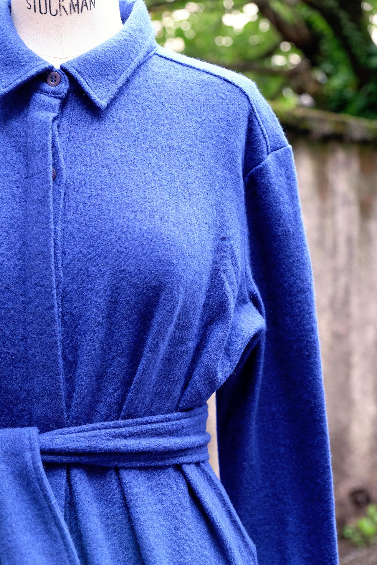 SOFTES DURCHGEKNÖPFTES WOLLKLEID MIT BINDEGÜRTEL UND EINGRIFFTASCHEN VON LE MONT ST MICHEL IN ROYALBLAU. KOMBINIERT MIT DEM STRICKMANTEL VON SEMICOUTURE UND DEM KASCHMIR-SEIDE SCHAL "LULU" VON FALIERO SARTI.