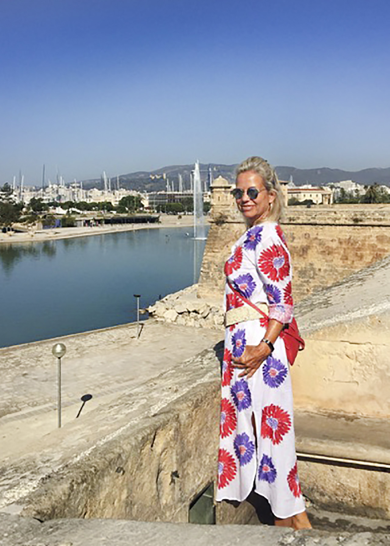 BRITTA ENJOYS PALMA IN HER NIMO EMBROIDERED DRESS.