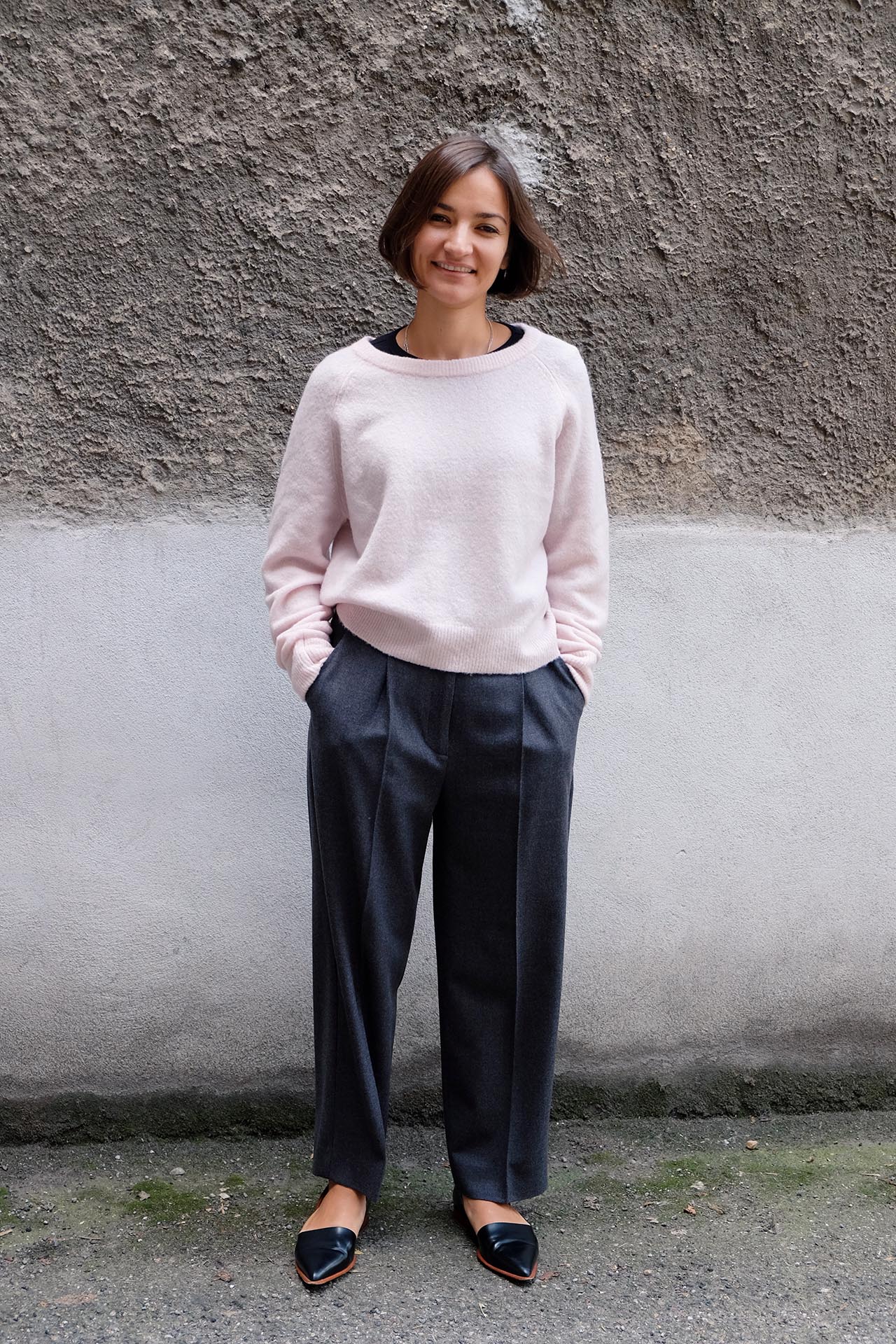 RANA TRÄGT DIE "MARKET TROUSER" VON YMC KOMBINIERT MIT DEM KUSCHELWEICHEN PULLI VON DELICATELOVE IN DER FARBE POWDER.