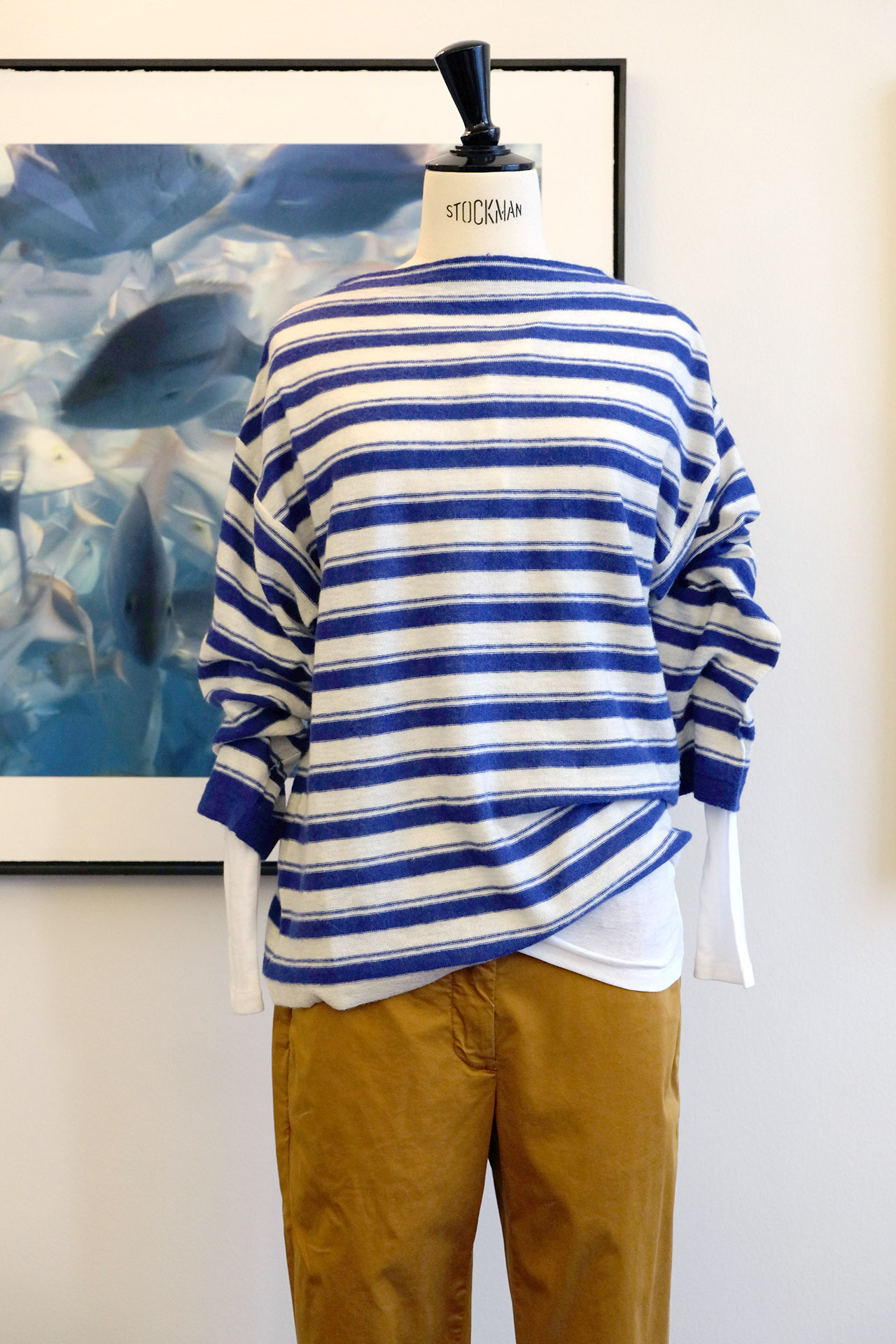EIN FRÖHLICHER GUTE LAUNE PULLI IN KNALLBLAU-WEISS GERINGELT. ER IST AUS 40% BABY-ALPAKA, 10% EXTRA FINE WOOL UND 50% POLYAMID.