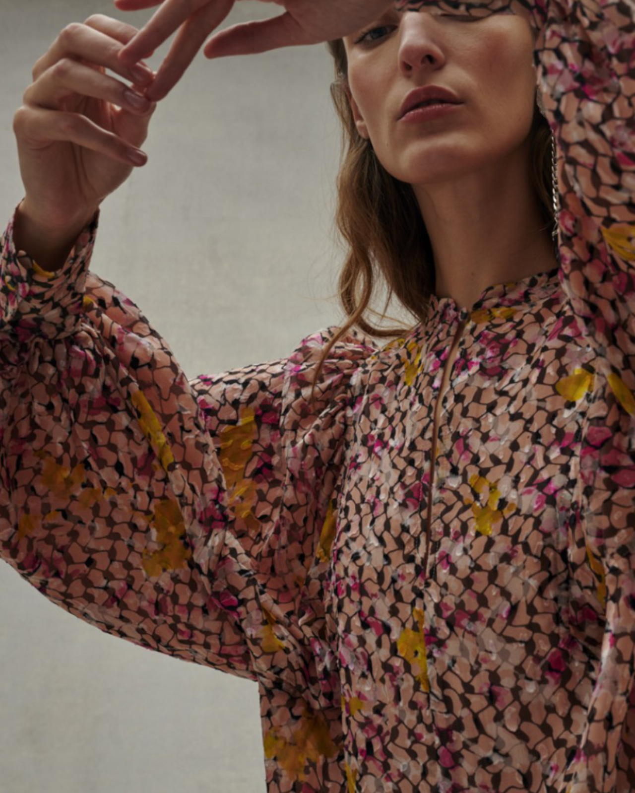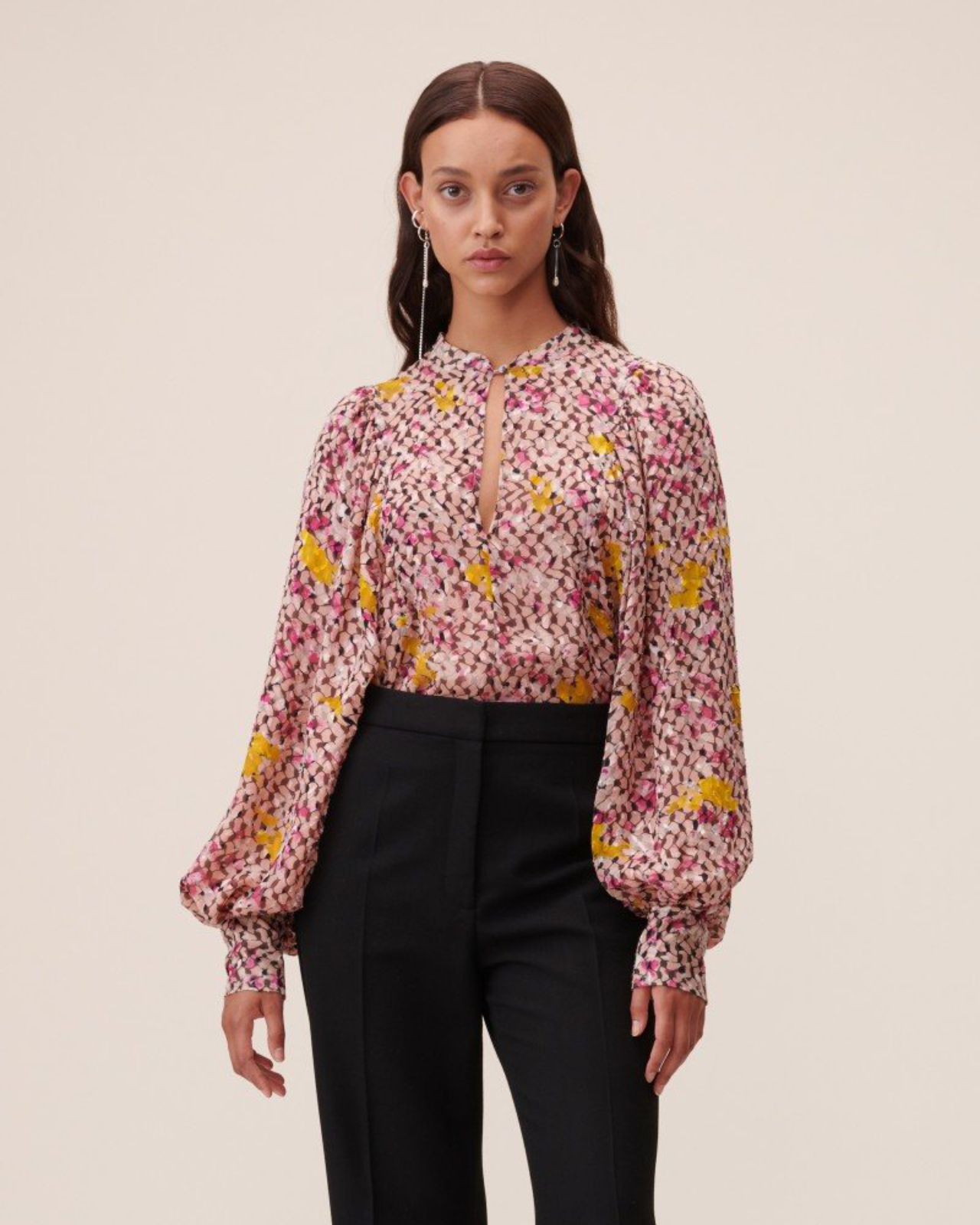 BLUSE MIT AKZENTUIERTEN ÄRMELN VON LALA BERLIN, BEDRUCKTER SEIDEN-VISKOSE-DEVORÉ IM KUFIYA COSMOS PINK PRINT: 295€