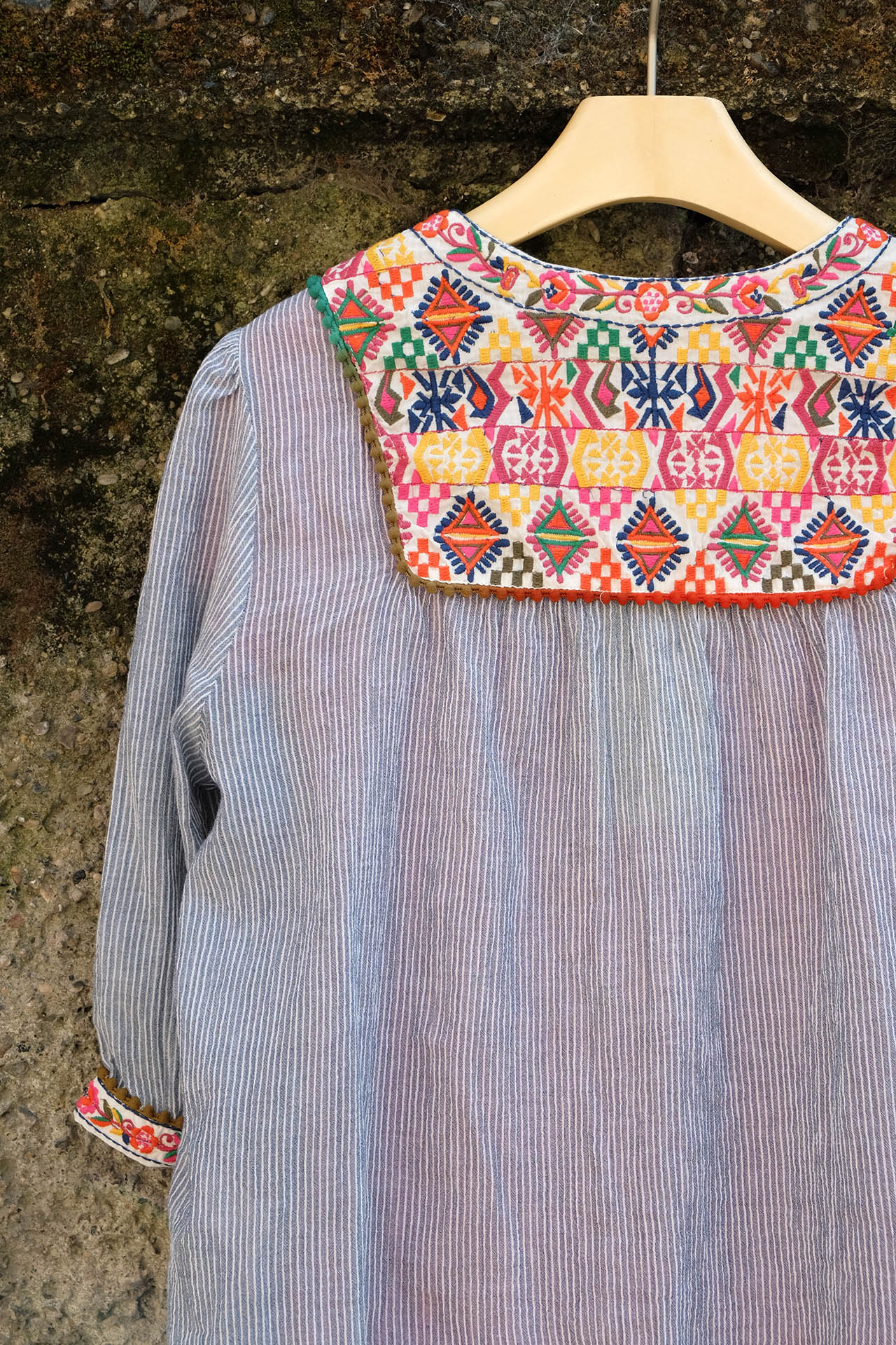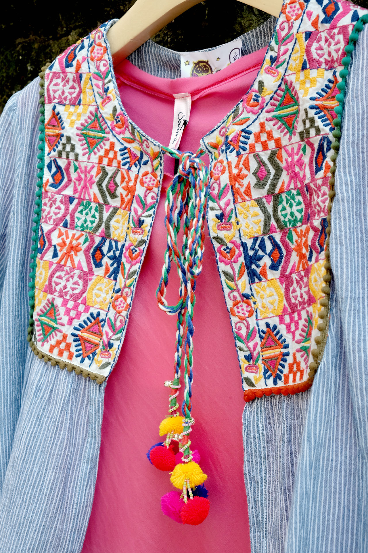 BESTICKTES HIPPIE-JÄCKCHEN VON PEACE AND LOVE. KOMBINIERT MIT DEM LUFTIGEN SEIDENTOP VON SOUVENIR.