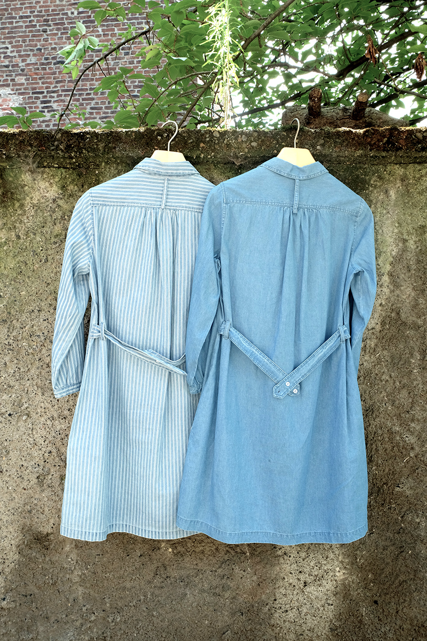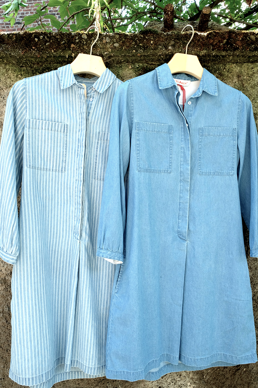 Die schönen Jeanskleider gibt es einmal einfarbig und einmal mit schmalen weißen Streifen. Der Stoff fühl sich leicht und weich an und lässt sich daher auch gut an schönen Sommertagen tragen. Hinten sind die Kleider mit einem verstellbaren Band besetzt.
