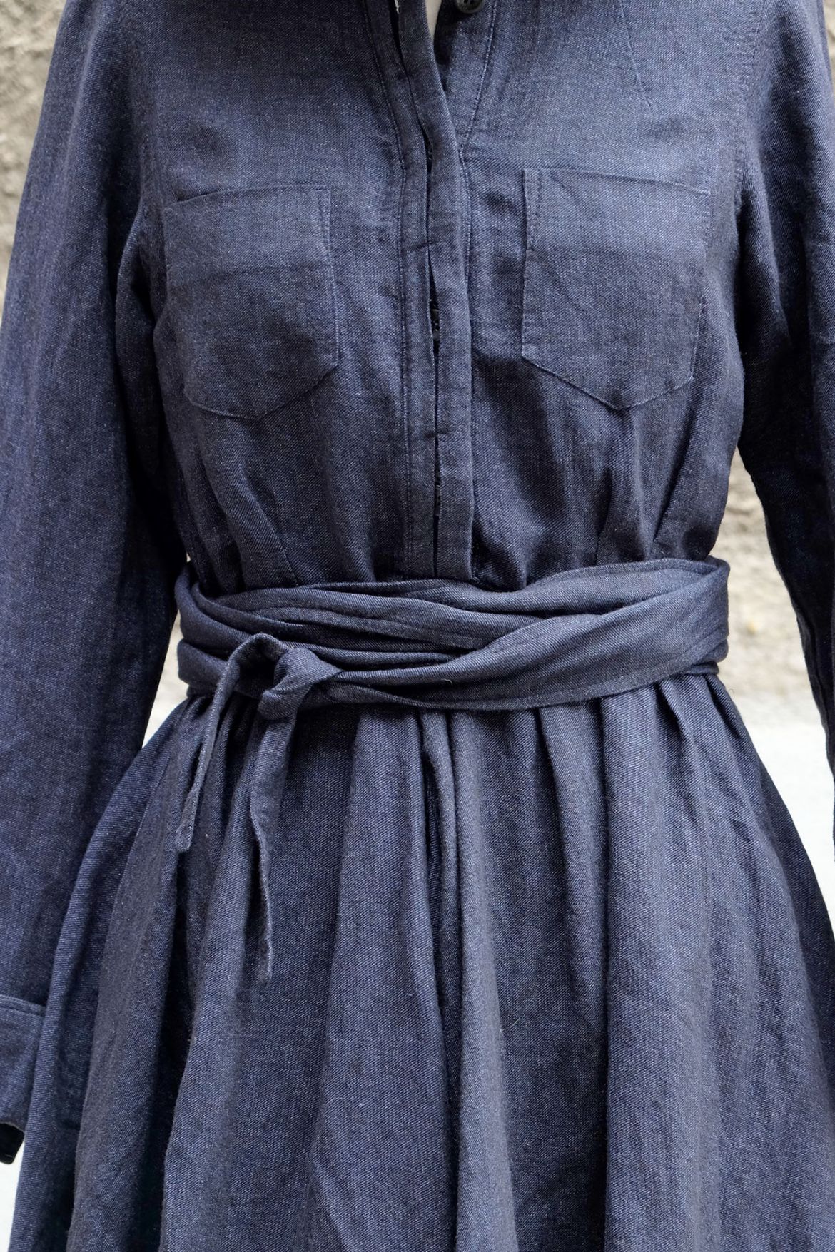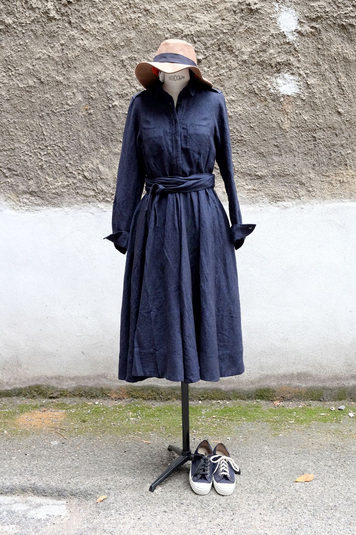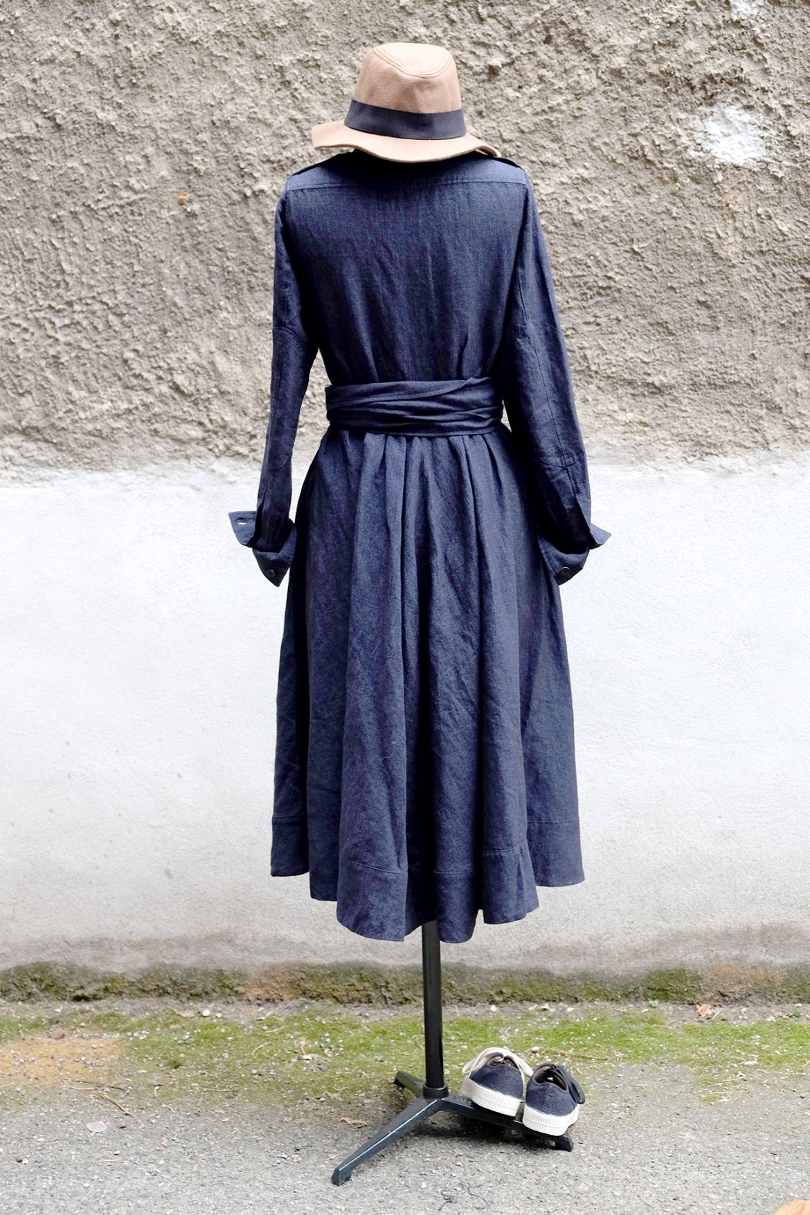 EIN TRAUMHAFTES HERBSTKLEID MIT WEIT SCHWINGENDEM ROCK AUS EINER UNGEWÖHNLICHEN LEINEN-WOLL-MISCHUNG VOM MÜNCHNER LABEL HANNES ROETHER.