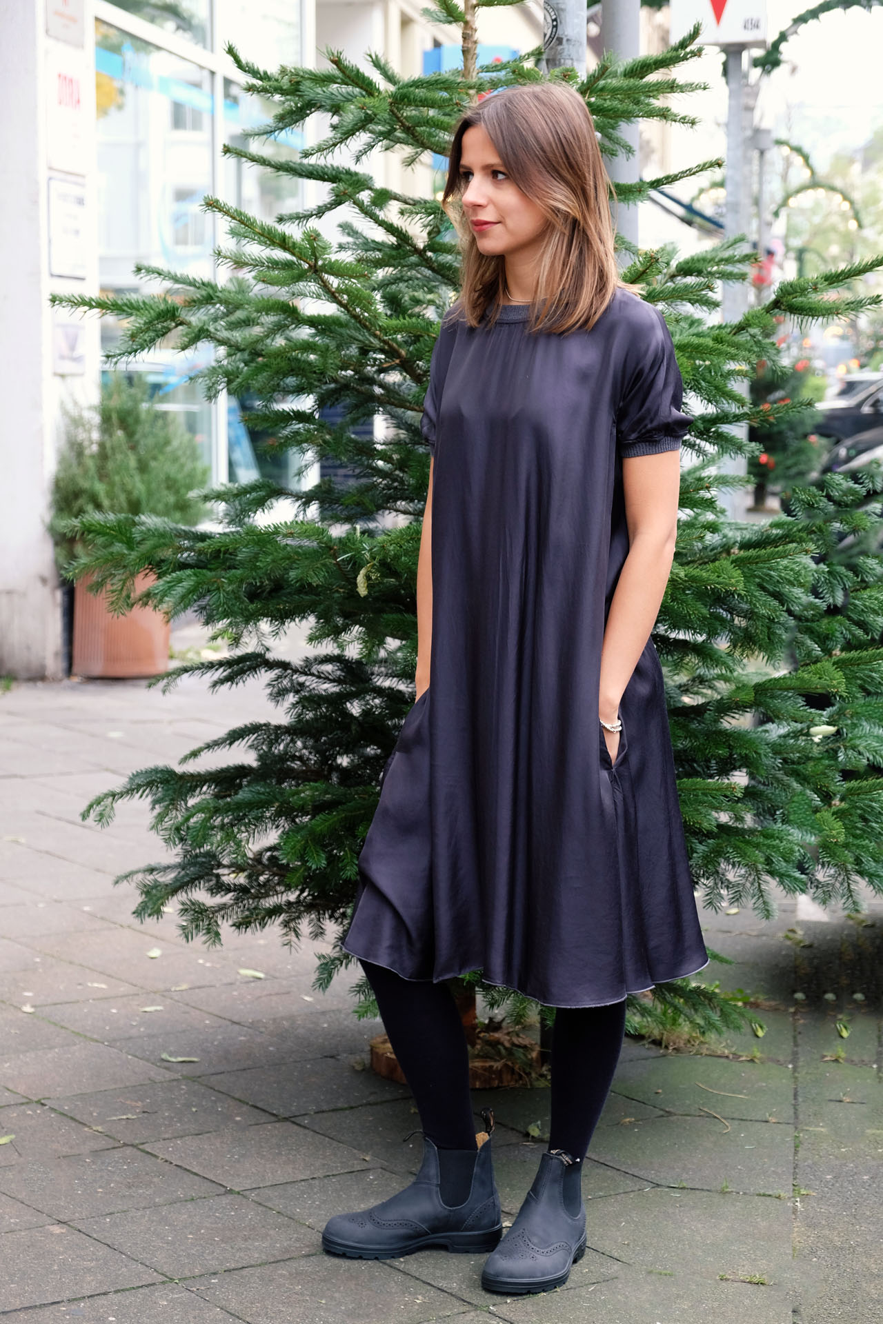 SPORTLICHES, GLÄNZENDES KLEID "ANTRA" MIT STRICKBÜNDCHEN UND EINGRIFFSTASCHEN: 285€
