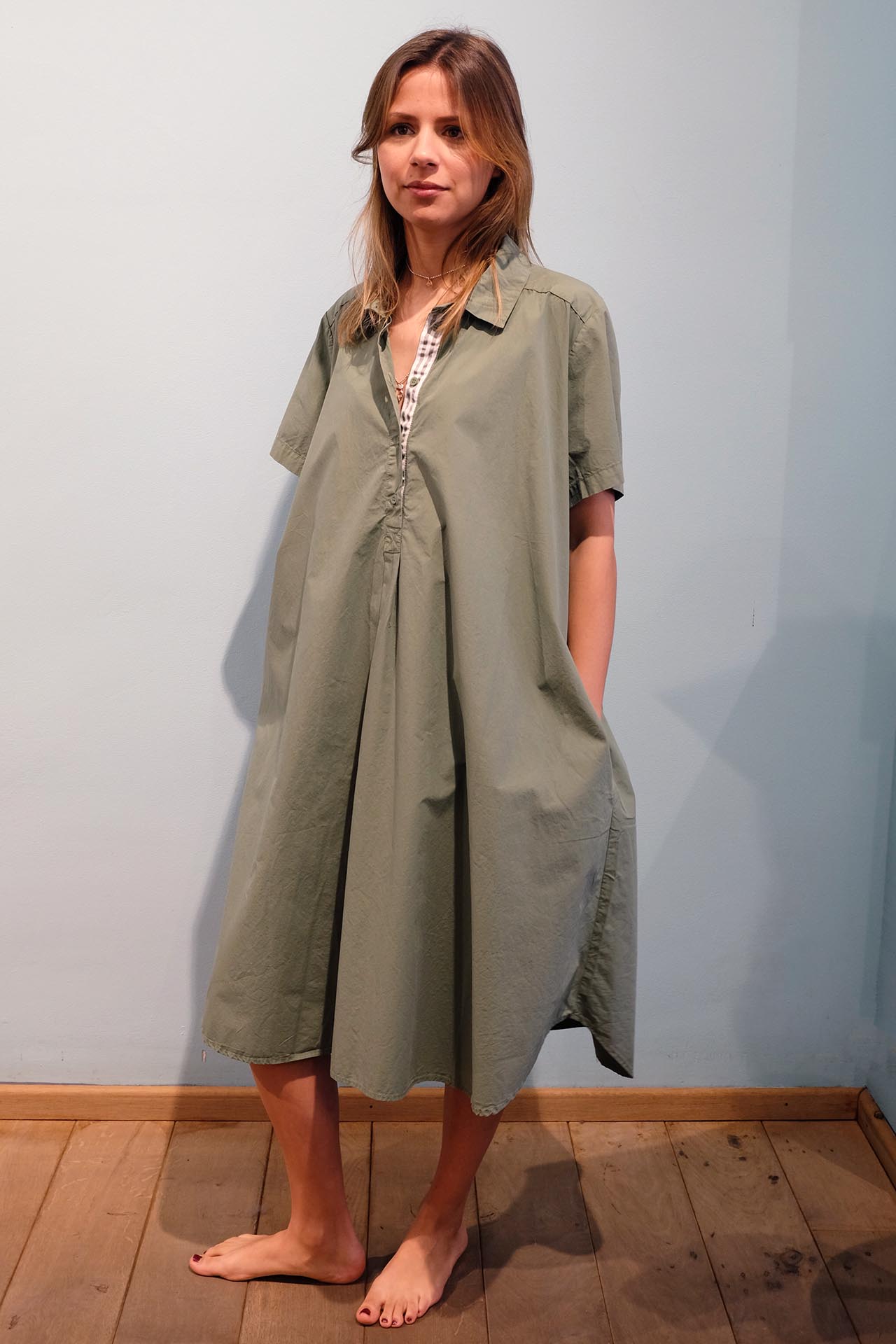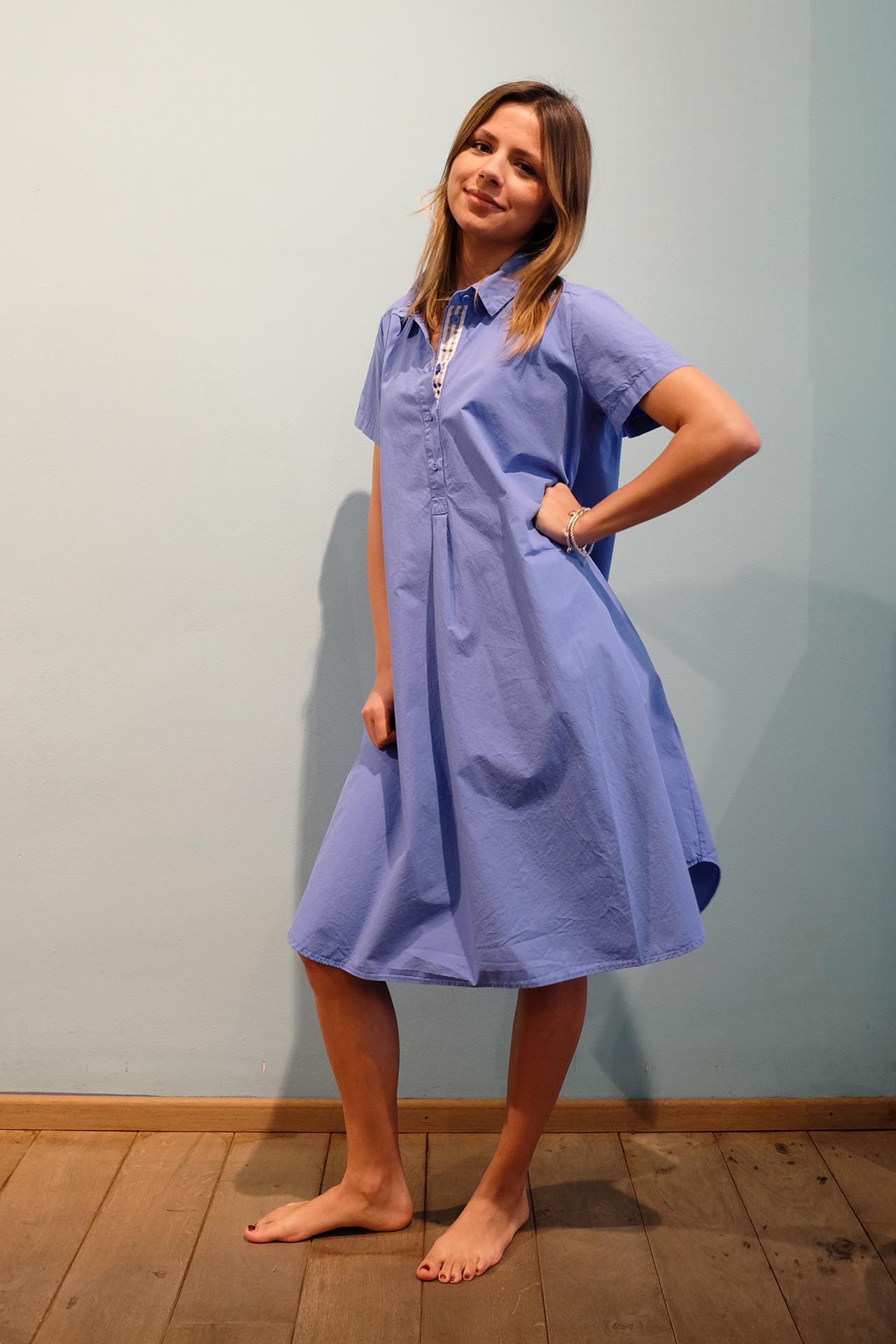 KLEID CARA IN DEN FARBEN SALVIA, AZZURRO UND CARAMMELLO.