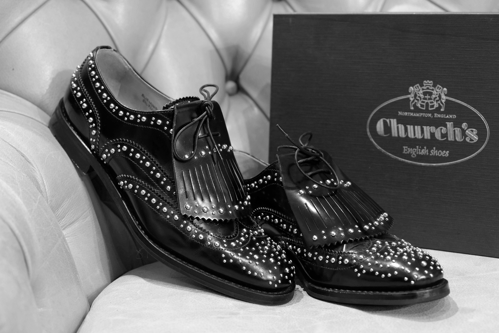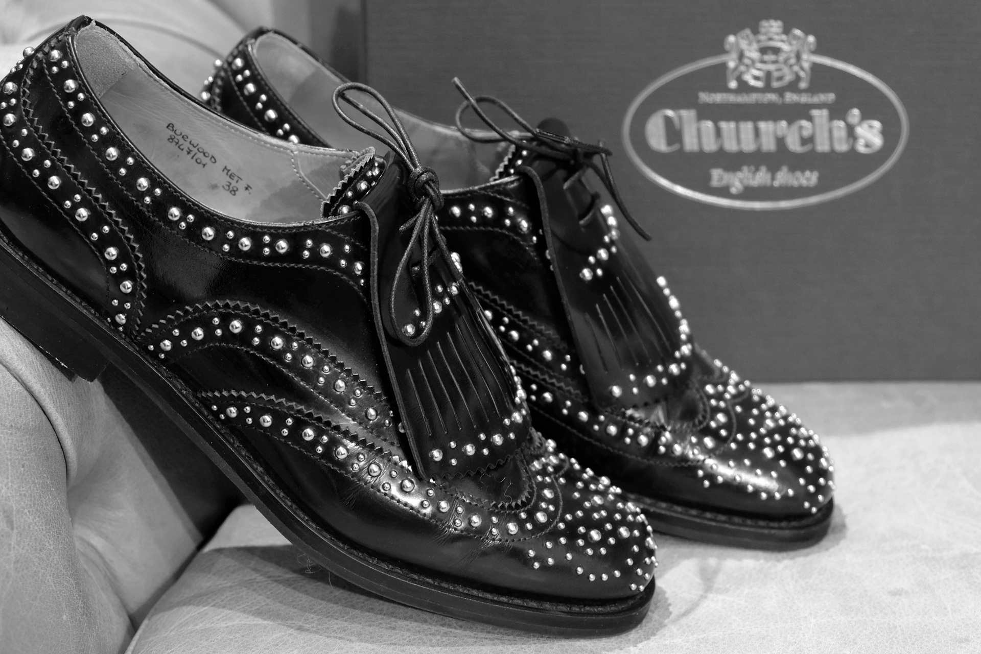 SCHWARZE "BURWOOD" SCHNÜRSCHUHE MIT NIETEN UND ABNEHMBARER LASCHE VON CHURCH`S. DIE ELEGANTEN LEDERSCHUHE AUS ENGLAND WURDEN EINMAL AUF DEM FOTOSHOOTING FÜR DIE HERITAGE POST GETRAGEN DAHER SIND SIE VON 950€ AUF 500€ REDUZIERT. GRÖSSE 38.