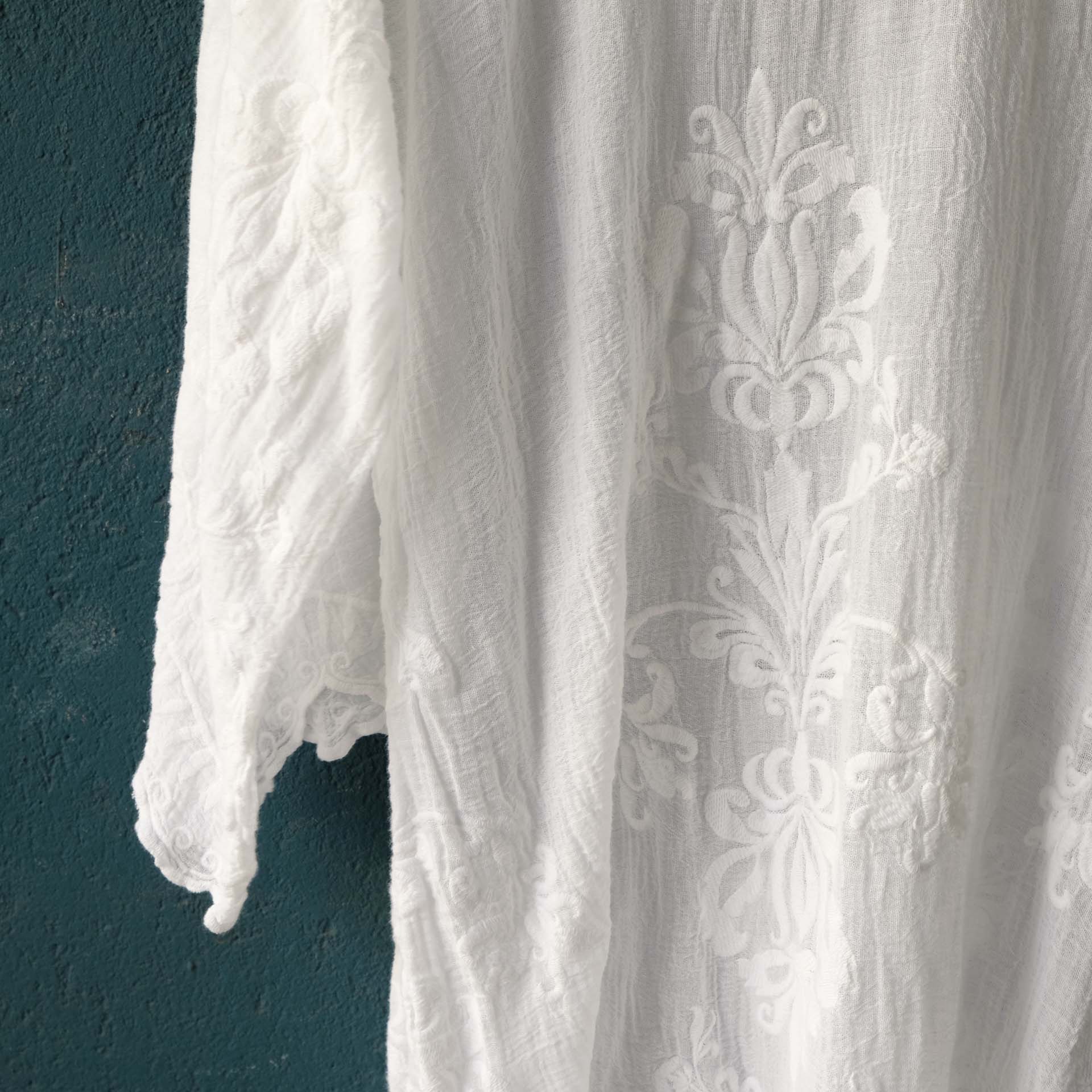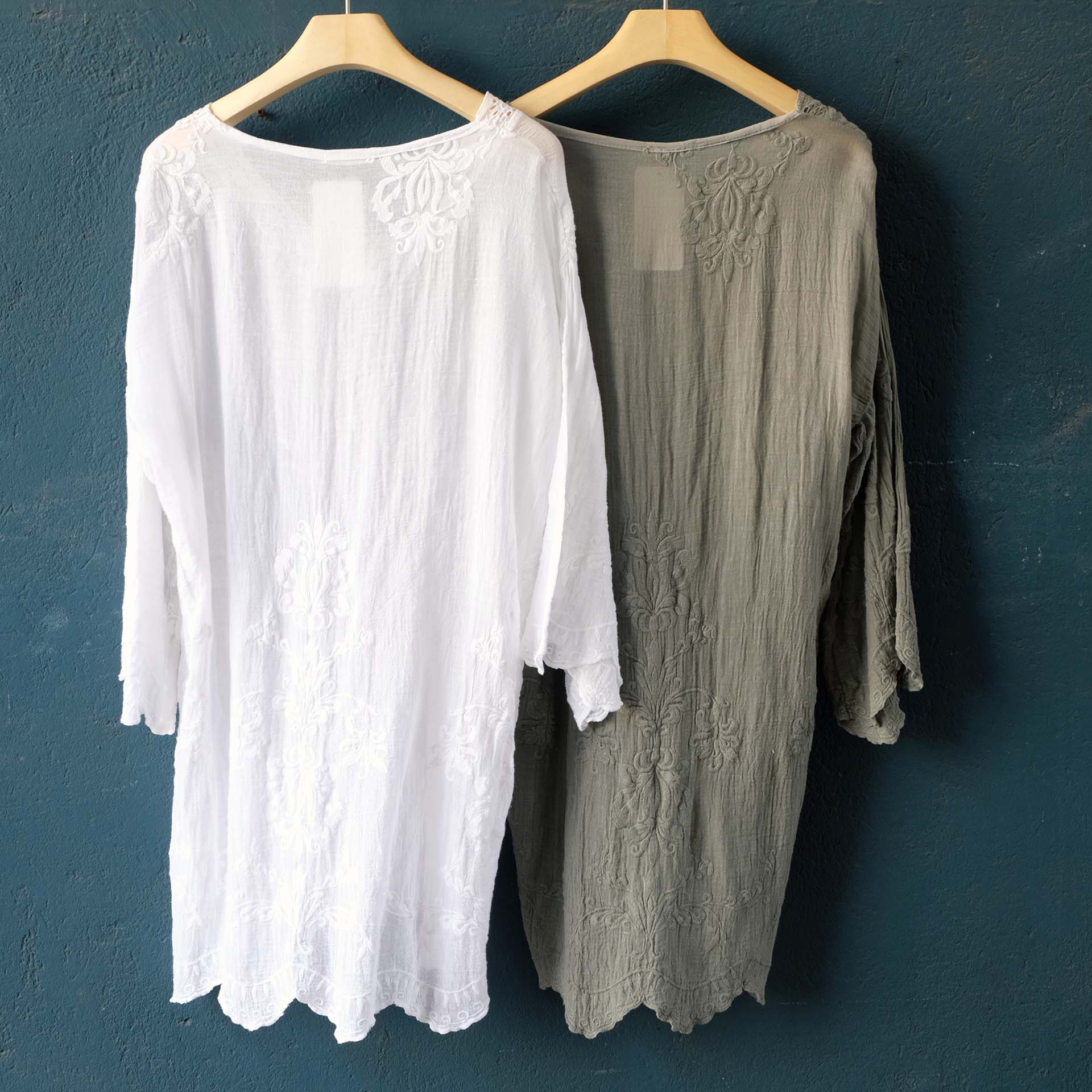 SOMMERLICHES, MIT BLUMEN BESTICKTES LEINENKLEID IN KHAKI UND WEISS: 39€