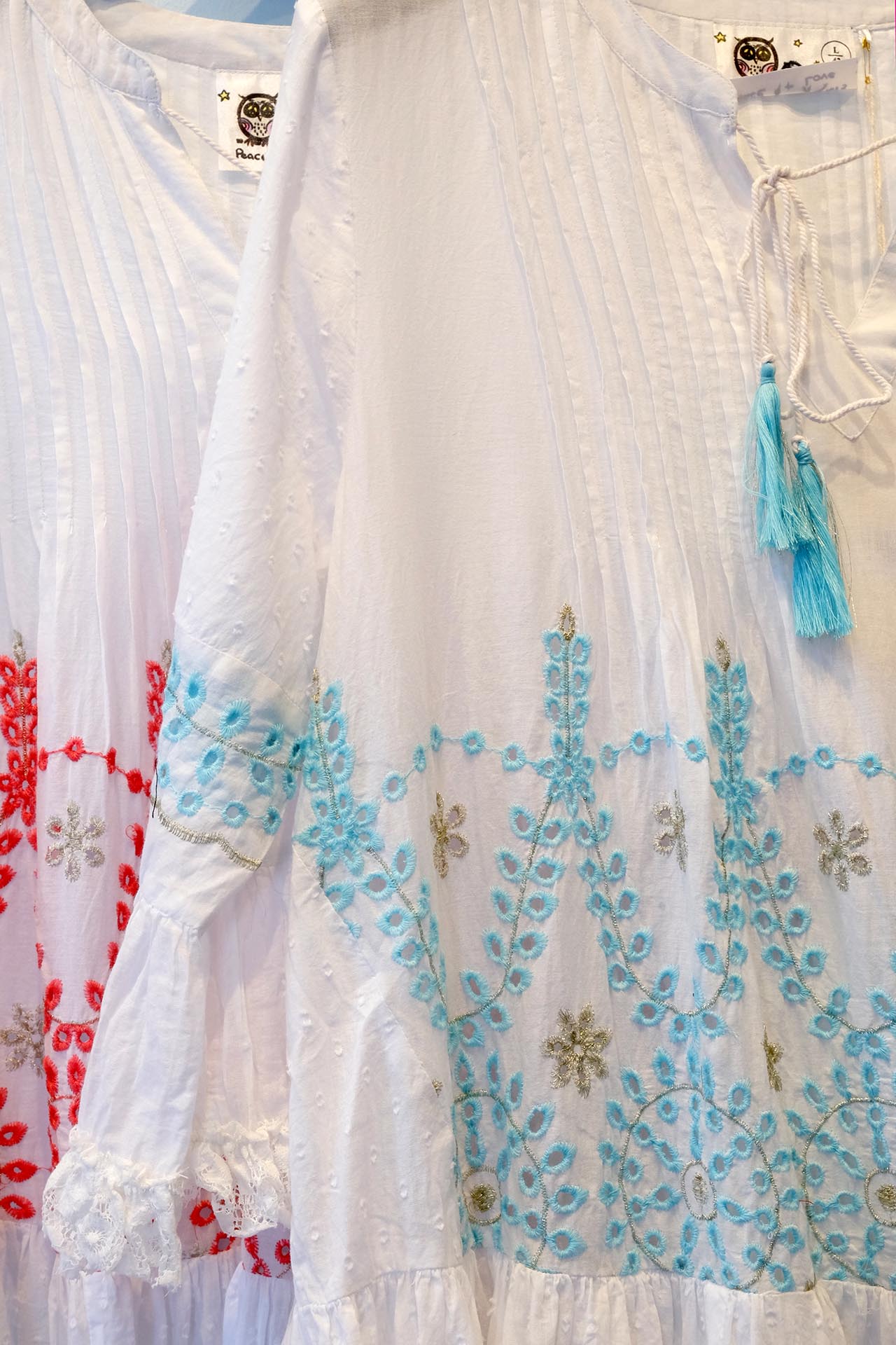 LUFTIGES SOMMERKLEID MIT STICKEREIEN IN TURQUESA UND NARANJA.