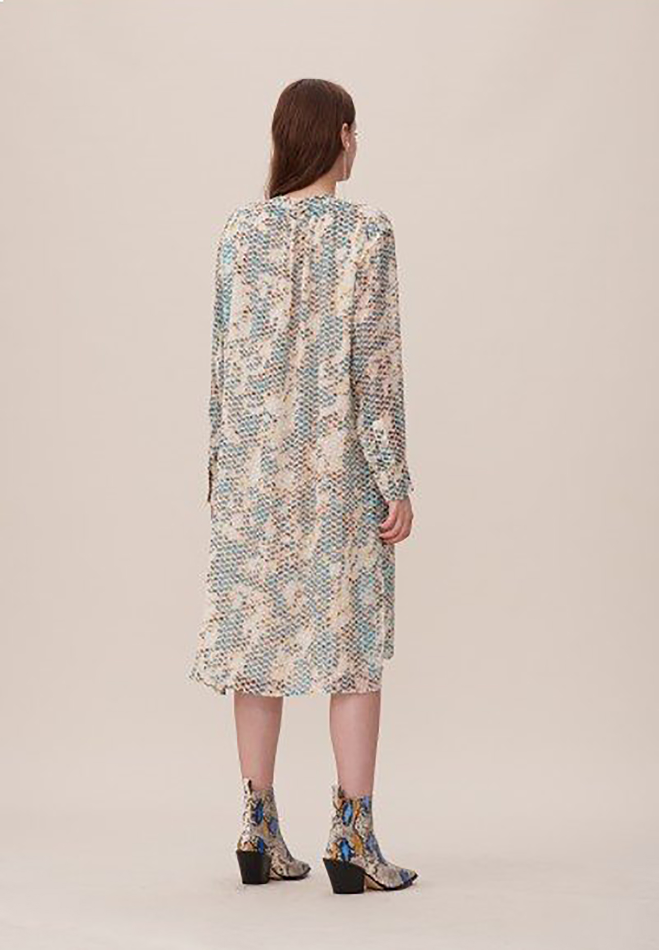 "GET ON THE SNAKE" - TYPICAL LALA BERLIN PREMIUM SILK DRESS WITH THE ICONIC KUFIYA PRINT. THIS TIME AROUND IN SOFT BLUE, MORPHING INTO AN ABSTRACT SNAKESKIN PRINT: 445€